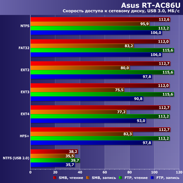 Следующая группа тестов проводилась для оценки скоростных возможностей роутера для сценария сетевого накопителя. Для этого использовался SSD с адаптером на USB 3.0. Отметим, что для полноценной работы с этой версией шины необходимо изменить одну из опций в настройках беспроводной точки доступа на 2,4 ГГц. Скорость оценивалась на задачах чтения и записи одного большого файла по протоколам SMB и FTP при использовании поддерживаемых роутером файловых систем.