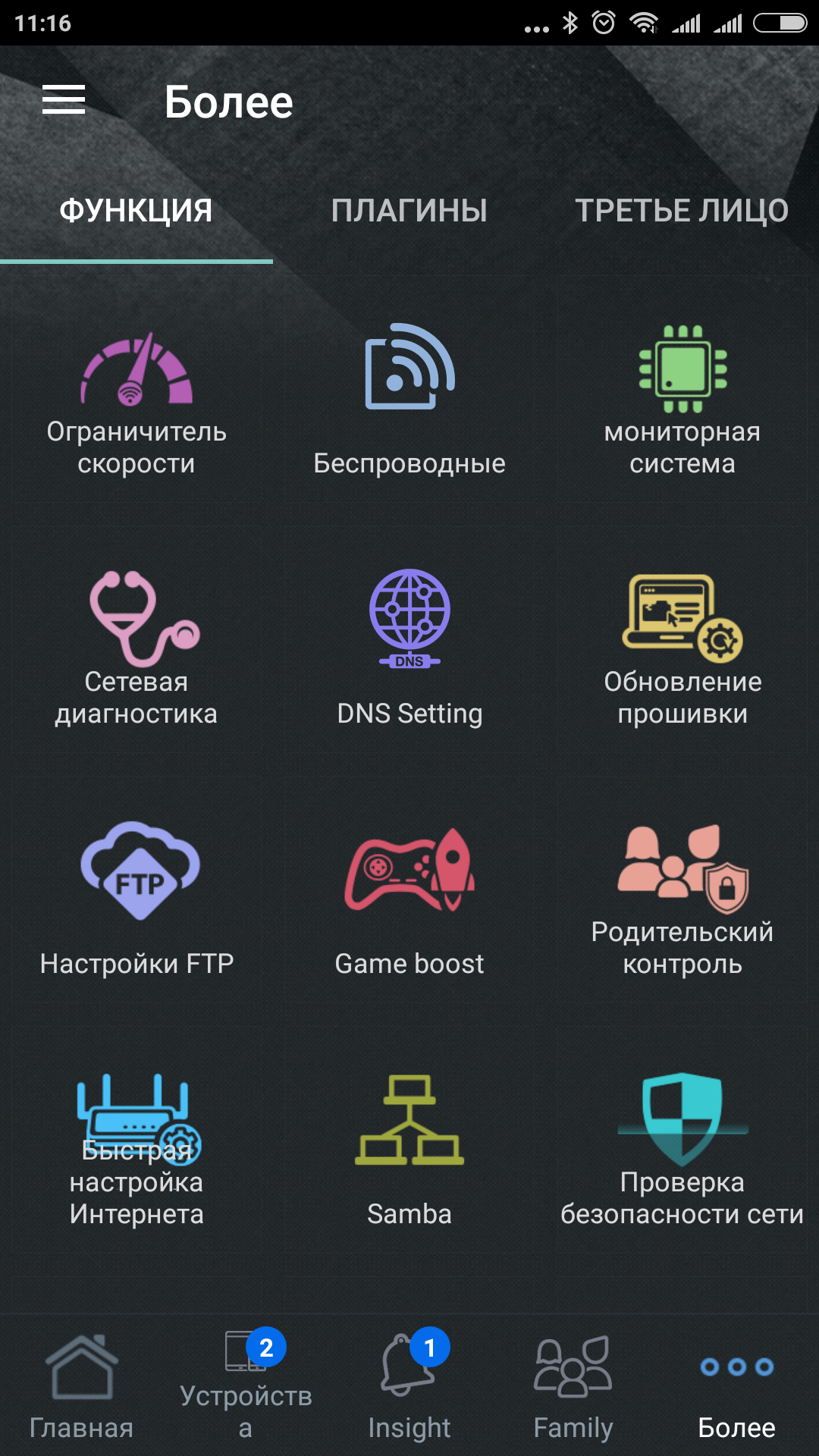 Все остальные настройки мобильной утилиты собраны за кнопкой «Более». Здесь находятся значки доступа к 16 дополнительным функциям, ссылки на другие фирменные программы Asus и сторонних компаний для работы с роутером. Некоторые из пунктов дублируют доступ к тем же настройкам, о которых мы говорили выше. Например, это касается «Ограничителя скорости», «Статистики трафика», «Родительского контроля» и других.