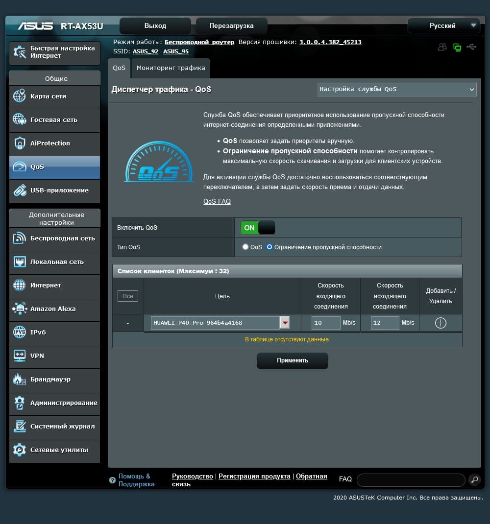 Сервис управления полосой пропускания (QoS) может работать в двух режимах — ограничение полосы загрузки и передачи указанных клиентов по списку или приоритизация трафика согласно установленным правилам. В последних учитываются адреса, порты и размеры пакетов.