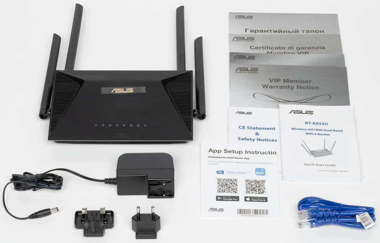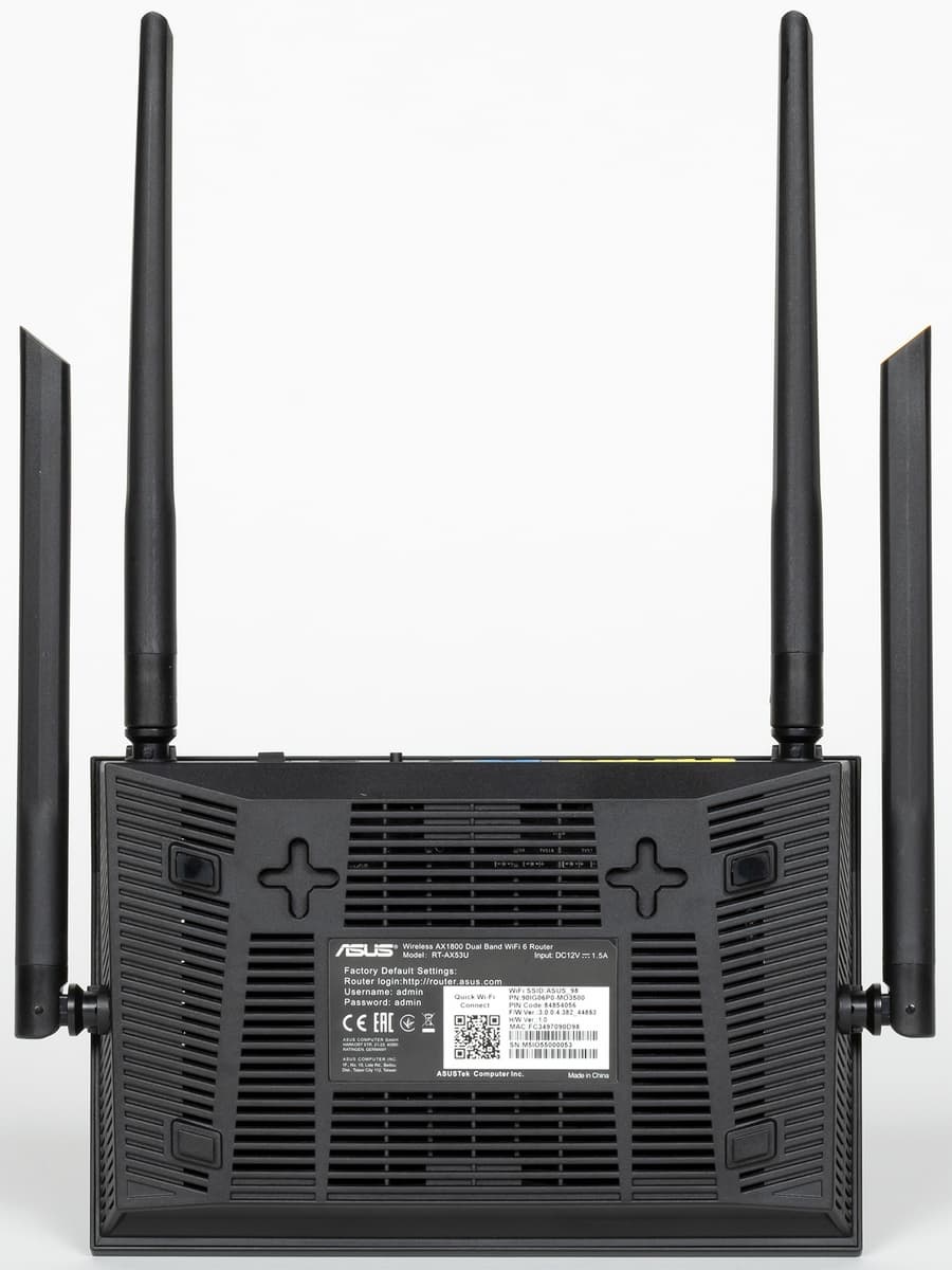 В этот раз мы решили познакомиться с устройством начального уровня — роутером Asus RT-AX53U. Эта модель оборудована гигабитными сетевым портами, имеет беспроводной модуль класса AX1800 и порт USB 2.0. С точки зрения возможностей встроенного программного обеспечения AsusWRT здесь есть практически всё, что мы привыкли видеть в прошивках этого производителя, включая набор сервисов AiProtection, гостевые сети Wi-Fi, приложения для USB-накопителей, сервер VPN и так далее. По сути, единственным заметным отличием от старших моделей можно назвать только отсутствие поддержки AiMesh.