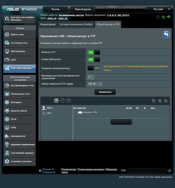 Сетевой доступ к файлам осуществляется по протоколам SMB (только версии 1.0, которую в современных ОС Windows нужно специально включать) и FTP. При этом второй вариант работает и через интернет. Номер порта, к сожалению, поменять нельзя, шифрования тоже нет. При необходимости можно настроить несколько пользовательских аккаунтов с разными правами для доступа к отдельным папкам накопителя. Большинство пользователей будет использовать в данном случае NTFS. Но предусмотрена поддержка и «родных» для Linux файловых систем.