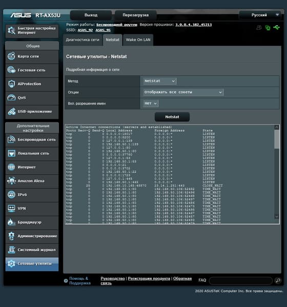 Также в роутере предусмотрены встроенные сетевые утилиты для проверки работы устройства — ping, traceroute, nslookup и netstat. В этой же группе находится страница для отправки клиентам локальной сети пакетов WOL для включения питания (если эта технология поддерживается и корректно настроена).