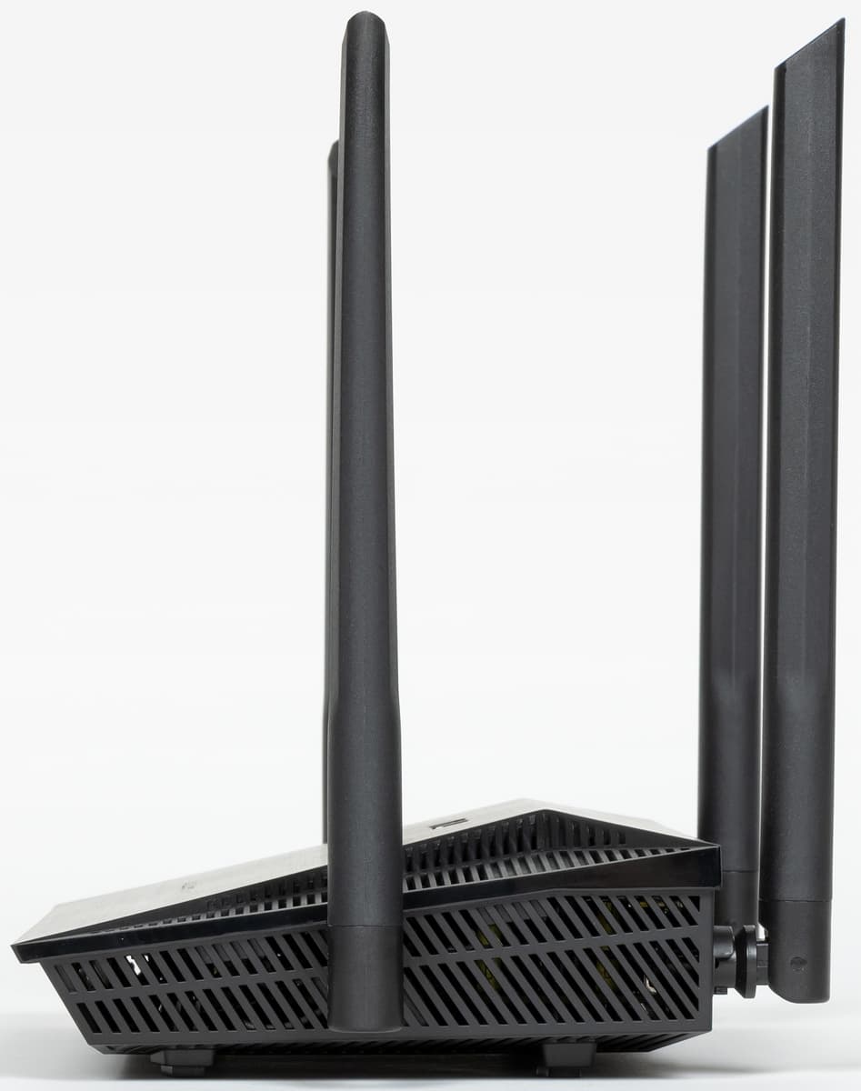 На фоне топовых моделей, рассматриваемый роутер можно назвать компактным — габаритные размеры без учета антенн и подключения кабелей составляют 190×125×48 мм. Антенны несъемные, установлены сзади и на боковых сторонах. Длина подвижной части составляет 175 мм. С учетом этого, в случае вертикального расположения антенн роутеру потребуется около 230×150×190 мм пространства для установки.
