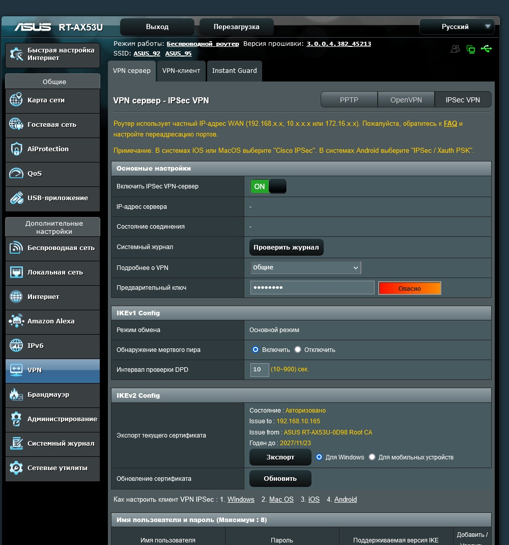 Одной из популярных дополнительных функций современных роутеров являются технологии VPN. В прошивке рассматриваемой модели есть возможность организации сервера VPN с поддержкой протоколов PPTP, OpenVPN и IPSec. Напомним, что для их работы обязательно иметь «белый» адрес от провайдера.