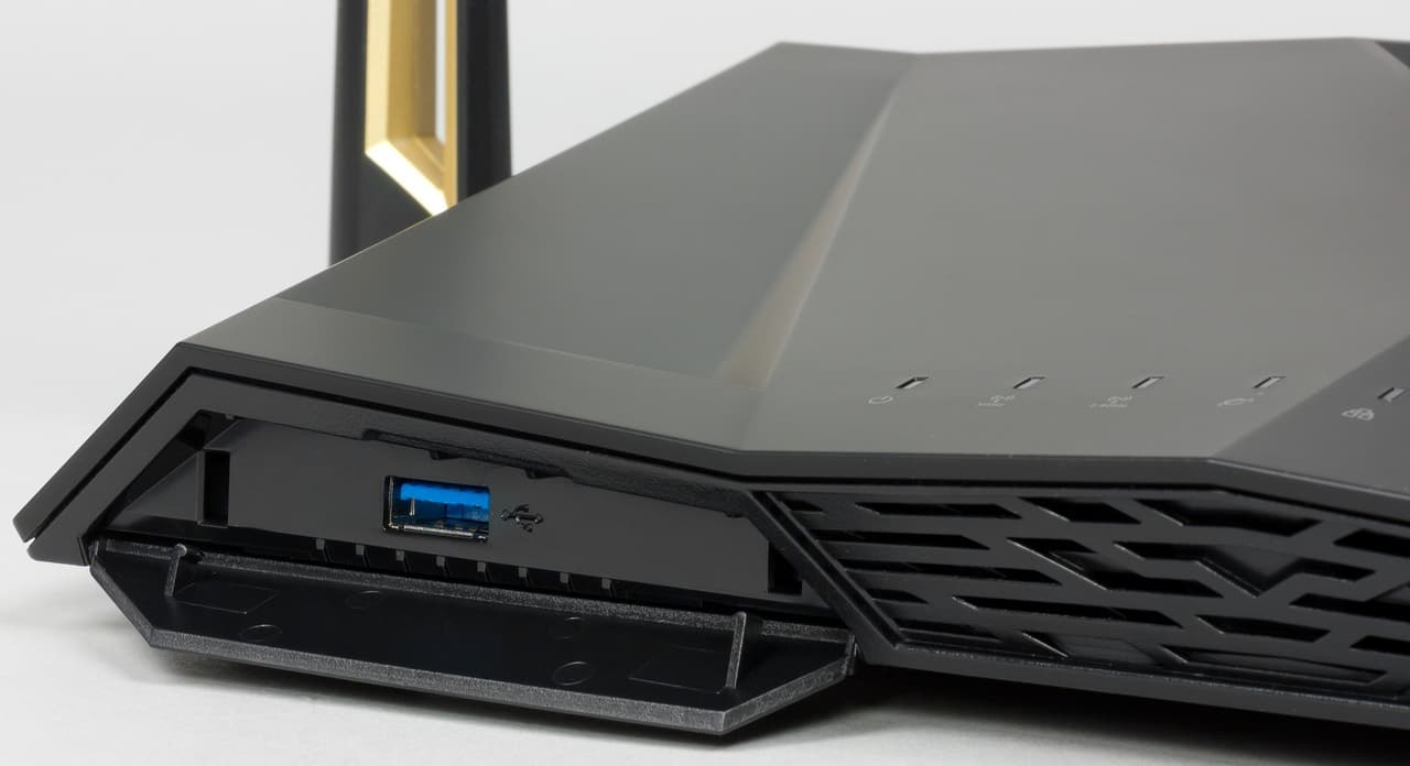 В отличие от серии игровых роутеров компания решила не придумывать новый дизайн, а использовать ранее разработанный вариант. Учитывая, что роутеры подобного уровня меняют все-таки не очень часто, это вполне разумное решение с точки зрения более быстрого выхода на рынок. В целом, существенных замечаний к конструкции устройства нет. Единственное, к чему можно придраться — отсутствие индивидуальных индикаторов для портов LAN. Ну и крышка для фронтального разъема USB в открытом состоянии выглядит не очень красиво.