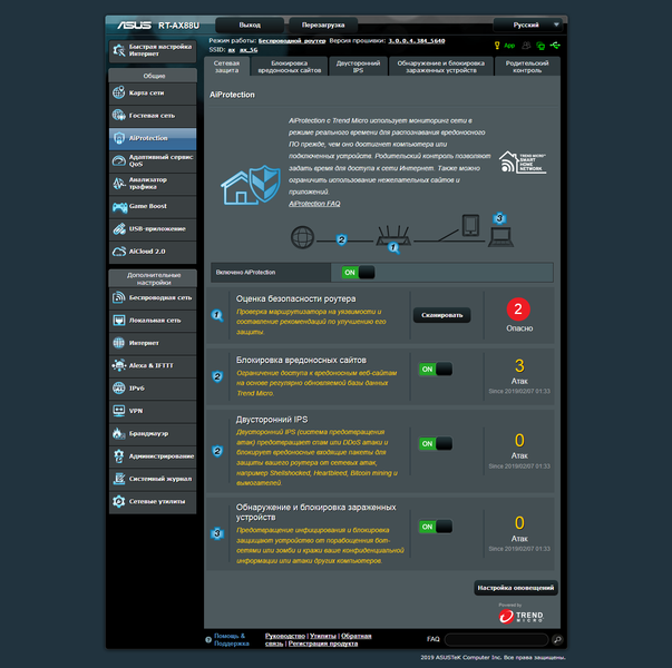 Более оперативно реагировать на угрозы и обеспечить гибкую настройку правил безопасности помогут функции AiProtection, реализованные на базе технологий Trend Micro. Здесь есть сканер настроек роутера, блокировка вредоносных сайтов, обнаружение зараженных устройств в локальной сети, родительский контроль (фильтры ресурсов по типам и расписание доступа к интернету).