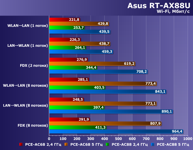 Но начнем с наших обычных клиентов — адаптеров Asus PCE-AC68 и PCE-AC88. Напомним, что это одни из наиболее быстрых современных адаптеров для настольных компьютеров. В данном тесте клиенты располагались на расстоянии около четырех метров от роутера на прямой видимости. Эти практически идеальные условия используются для оценки максимальных возможностей беспроводных точек доступа.