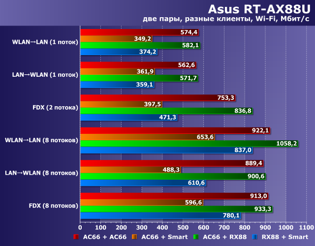 | WLAN→LAN (1 поток) | AC66 + AC66 | AC66 + Смартфон | AC66 + RX88 | RX88 + Смартфон |