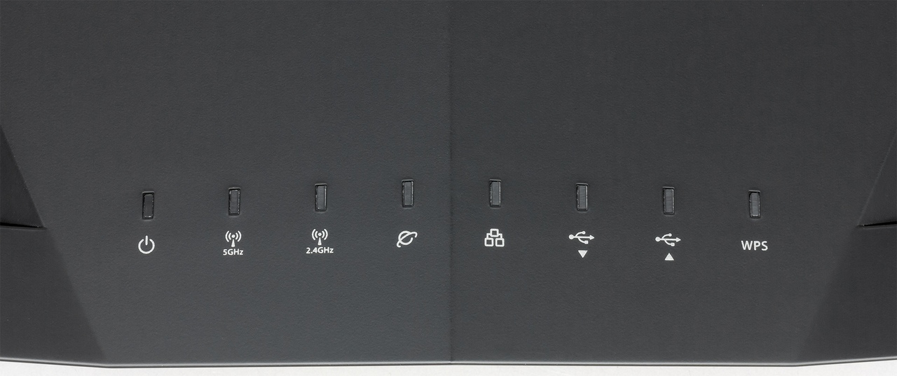 Набор стандартный — питание, статус подключения к интернет, Wi-Fi 2,4 ГГц и 5 ГГц, два для портов USB, один общий индикатор активности портов LAN и WPS. Из дополнительных органов управления на переднем торце предусмотрены крупные кнопки отключения индикаторов и Wi-Fi. С левой стороны за откидывающейся крышкой установлен порт USB 3.0.