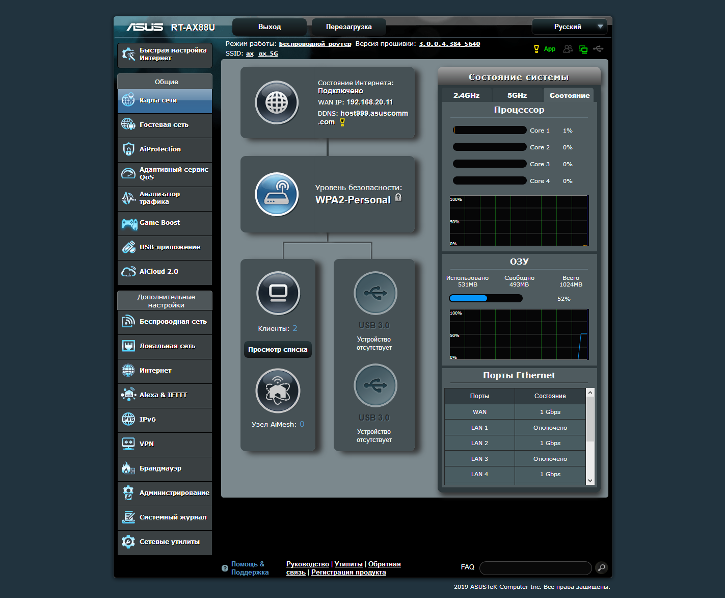 Первая страница после входа — «Карта сети». На ней приведена различная информация о состоянии роутера, включая клиентов, внешние устройства, интерфейсы и сети. Можно также посмотреть текущую нагрузку на процессор и память, а также статус проводных портов.