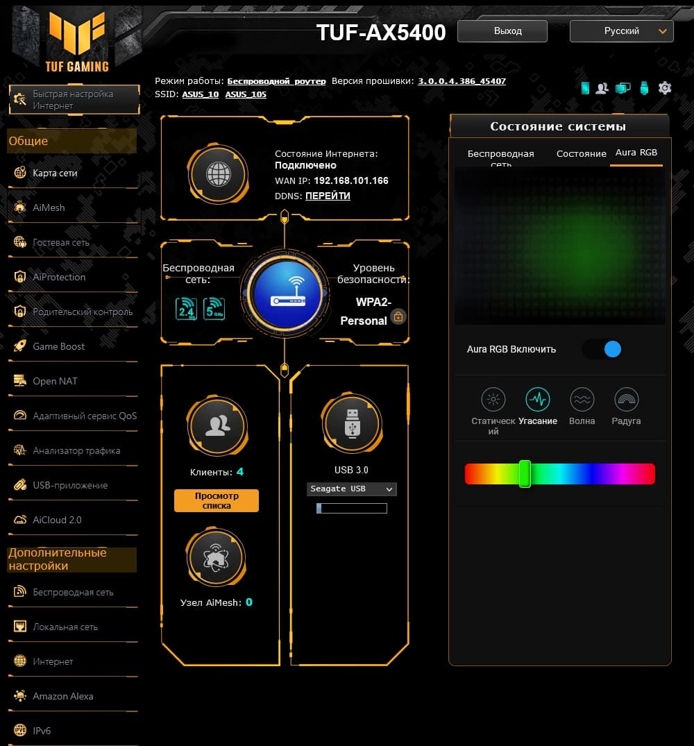 После входа, пользователь попадает на страницу «Карта сети». Здесь в удобном виде представлена основная информация о работе роутера: состояние подключения к интернету, клиенты, внешние устройства и так далее. При этом если щелкнуть мышкой на этих элементах, то в правой части страницы будет отображена более подробная информация о них. В частности, для самого роутера можно посмотреть загрузку процессорных ядер и памяти и состояние проводных портов. Кроме того, именно на странице «Карта сети» можно настроить работу подсветки Aura RGB. Правда, вариантов тут не очень много — светодиод всего один, хотя и многоцветный. Режимов четыре — постоянное свечение или медленное мигание выбранным цветом, «Волна» (медленное мигание фирменным желтым) и «Радуга» (переключение цветов по циклу). Подсветка работает автономно и никак не связана с состоянием роутера (например, актуальной скоростью или нагрузкой).