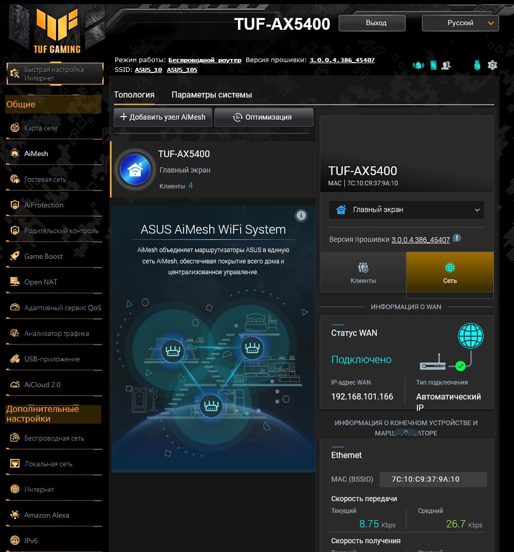 После карты сети идет раздел AiMesh. Это реализация Asus популярной сегодня технологии Mesh-сети. В систему может входить несколько устройств разного уровня, а не только одинаковые. При этом они подключаются друг к другу или через кабель, или по беспроводной сети. В итоге пользователь получает общее беспроводное покрытие и централизованное управление. В данном материале тестировался один роутер, поэтому рассказать что-то практическое по этой технологии не получится. Возможно, мы позже вернемся к этому вопросу.