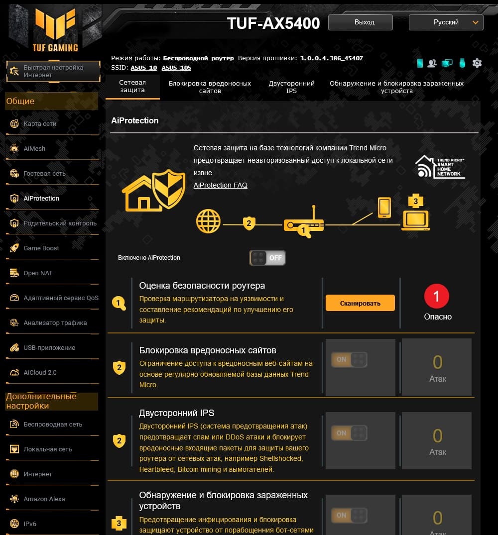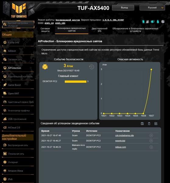 Набор сервисов AiProtection нам уже встречался ранее. Основанный на технологиях Trend Micro, он состоит из нескольких модулей: проверка настроек роутера с точки зрения безопасности, блокировка вредоносных сайтов, система обнаружения вторжений, обнаружение и блокировка зараженных устройств в локальной сети. Об обнаруженных нарушениях система может уведомлять пользователя по электронной почте.