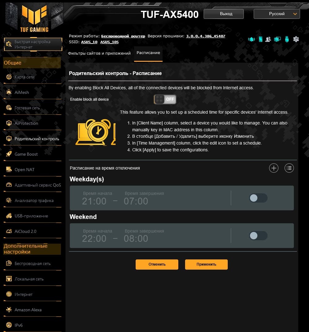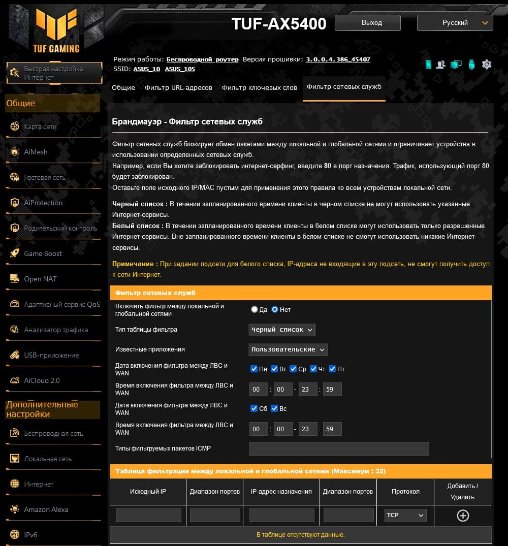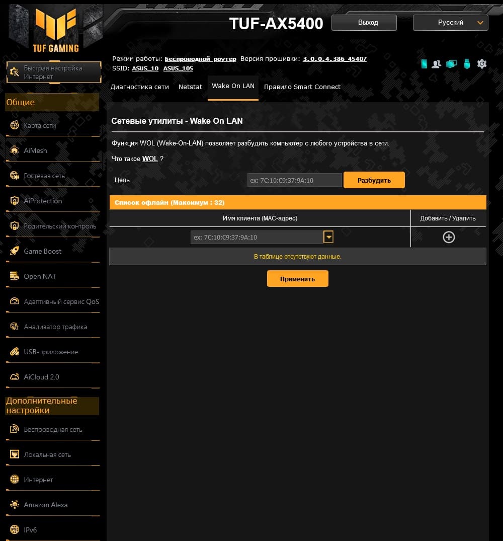 Как и у большинства производителей, возможности прошивки роутеров Asus верхнего сегмента мало отличаются друг от друга, как и дизайн веб-интерфейса. В любом случае, если вы уже работали ранее с таким оборудованием — обновиться будет несложно. У рассматриваемой модели обращает на себя внимание желто-черная гамма и логотип TUF GAMING в левом верхнем углу. Интерфейс имеет переводы на несколько языков, включая русский. Предусмотрен мастер быстрой настройки, в котором можно указать основные параметры работы устройства.