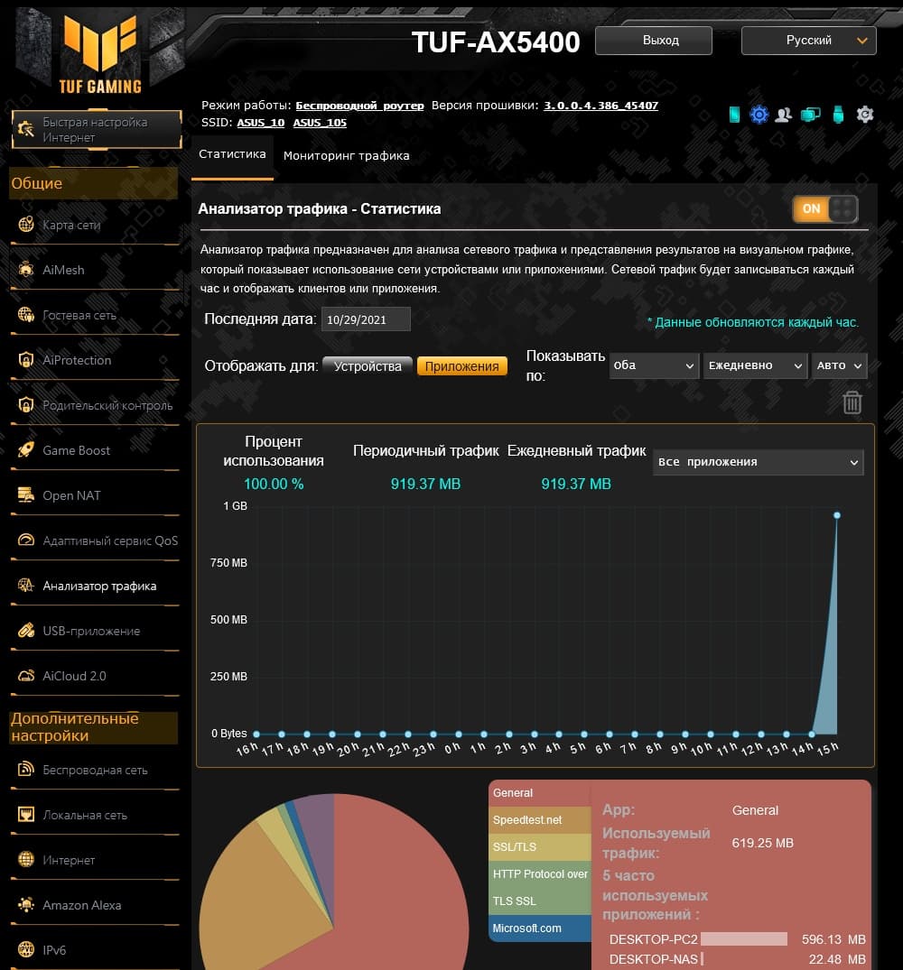 На отдельную страницу вынесен сервис анализа трафика. Он позволяет собирать данные с разбивкой по клиентам и приложениям для дальнейшей оценки. Статистика записывается каждый час. На графиках можно выбрать просмотр за сутки, неделю или месяц. На второй закладке страницы можно оценить текущий трафик по интерфейсам (WAN, LAN и отдельно два диапазона Wi-Fi).