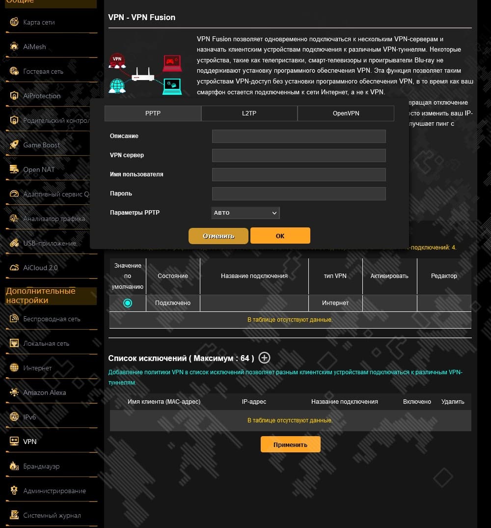 В некоторых ситуациях может пригодиться функция VPN Fusion. Она позволяет запрограммировать в роутере несколько профилей VPN-клиентов (PPTP, L2TP, OpenVPN) и далее назначить выбранным клиентам (до 64 записей) указанные профили. К примеру, таким образом можно вывести ТВ-приставку в интернет «из другой страны» и смотреть на ней телеканалы в фирменных программах студий.
