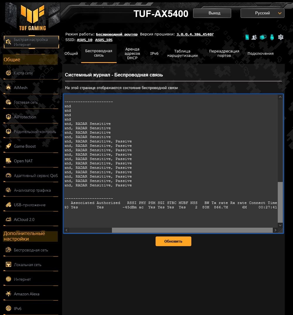 «Системный журнал» как и в других моделях Asus содержит не только сам журнал событий, но и отчеты по работе точек доступа (здесь можно посмотреть уровни сигналов и скорости подключения клиентов), аренде адресов сервера DHCP, таблицу маршрутизации, открытые по UPnP порты и таблицу текущих сетевых подключений.