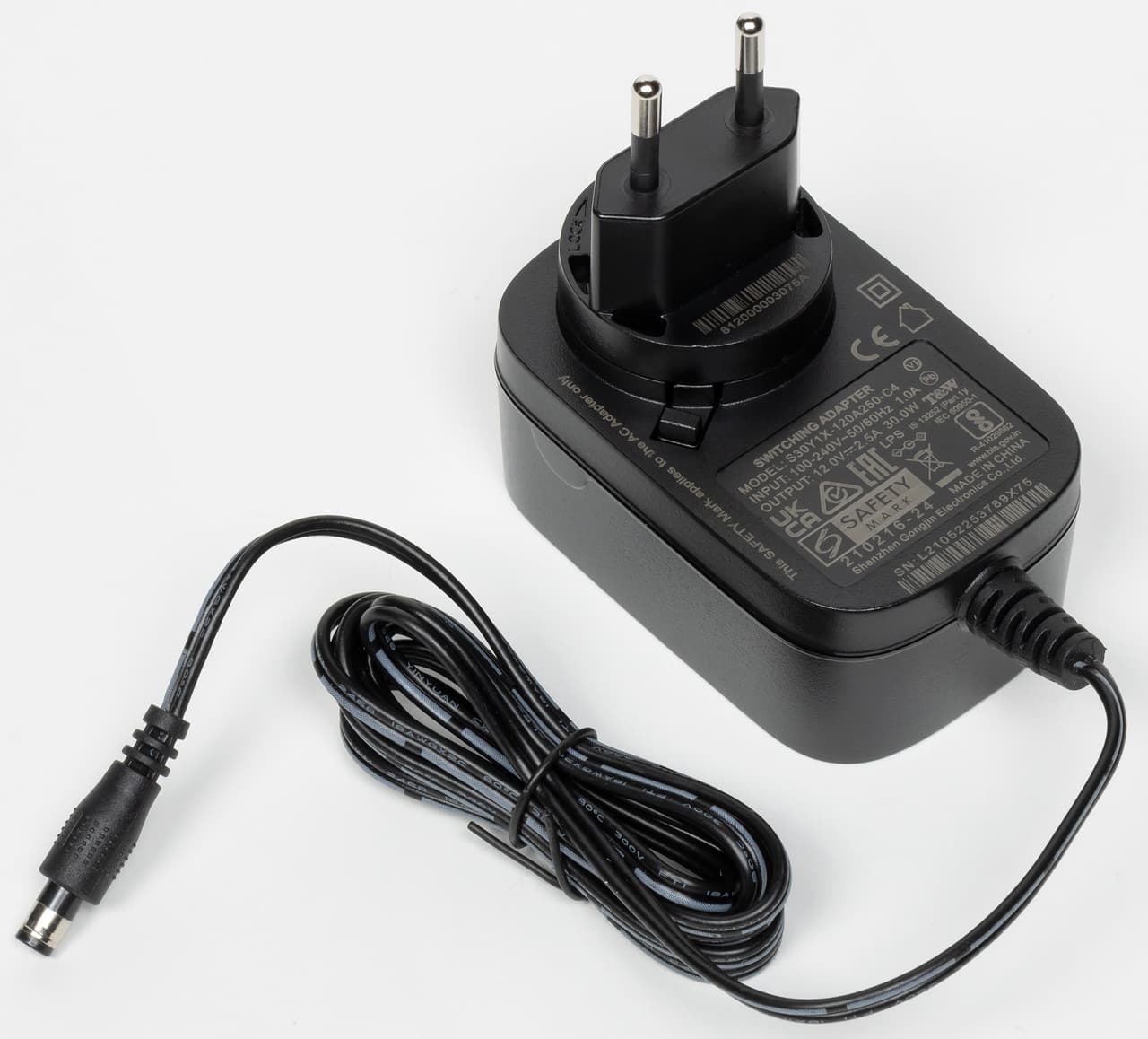 Он относительно крупный, но в большинстве случаев не будет мешать соседним розеткам. Параметры — 12 В 2,5 А (30 Вт), кабель имеет длину около полутора метров и заканчивается укороченным круглым штекером 5,5 мм.