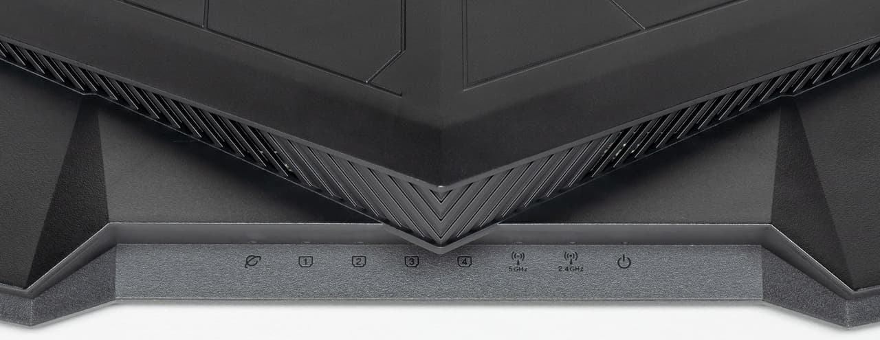На переднем торце разместили восемь светодиодных индикаторов, включая индивидуальные для отображения состояния и активности каждого порта LAN, что сегодня встречается все реже. Цвет большинства — белый. Только статус подключения к интернету может быть красным, если есть проблемы со связью.
