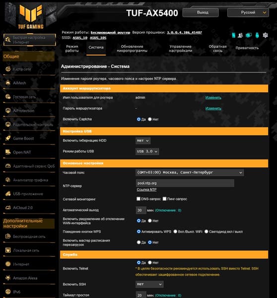 Страница «Система» раздела «Администрирование» позволяет настроить внутренние часы, включить доступ к консоли роутера по SSH или telnet, а также разрешить подключение к веб-интерфейсу со стороны интернета. Другие страницы раздела — обновление прошивки (в том числе и автоматически через интернет), управление конфигурацией и выбор режима работы. Последняя позволяет использовать роутер как точку доступа, мост, повторитель или узел сети AiMesh.