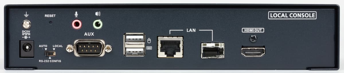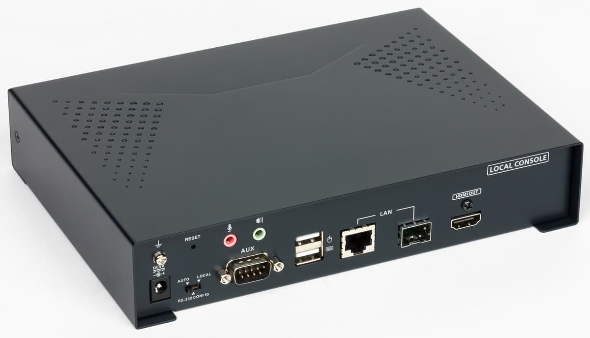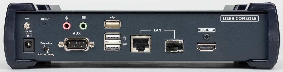 Блок передатчика подключается на удаленной площадке к требующему удаленного доступа компьютеру через набор портов на лицевой панели. Видео забирается по HDMI, устройства ввода обслуживаются через USB. Опционально можно реализовать прием и передачу аналогового звука через два порта, а также трансляцию последовательного порта RS-232.