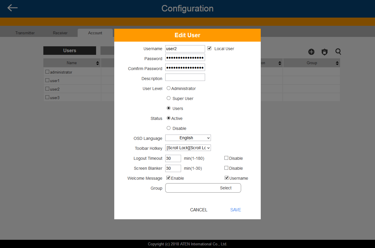 Аккаунты пользователей могут быть как локальные, так и с авторизацией через внешние сервисы (например, RADIUS или LDAP). Для каждого указываются несколько параметров, включая уровень доступа, язык интерфейса, таймауты отключения и другие.