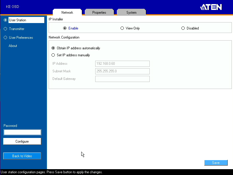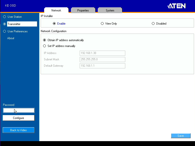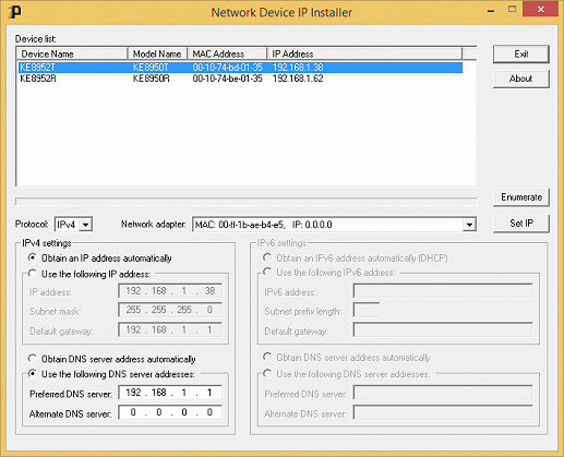 Если же речь о работе через локальную сеть, то нужно будет, как минимум, поменять адреса сетевых интерфейсов устройств. Для этого можно задать адреса каждому устройству индивидуально (соединив их в режиме точка-точка одним кабелем и после внедрив в сеть), либо воспользовавшись фирменной утилитой IP Installer, в которой можно установить IP-адреса передатчика и приемника в локальной сети (правда показалось странным, что она не спрашивает пароль для изменения настроек; если это является проблемой, то ограничить работу утилиты можно будет далее в настройках). При необходимости реализации матричной схемы, специальное программное обеспечение KE Matrix Management автоматически распознает все найденные в локальной сети устройства и переключит их в режим «Матрица».