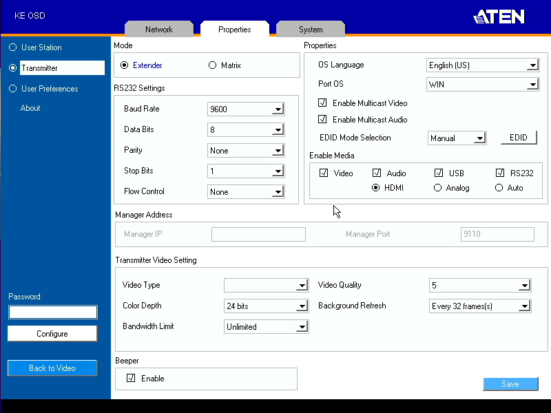 На второй — переключение между режимами один-к-одному и матрица, параметры последовательного интерфейса, настройка транслируемого контента, выбор качества передачи видео (в частности есть ограничение полосы на уровне 100, 200 или 500 Мбит/с). Здесь стоит обратить внимание также на пункт «EDID Mode Selection». Именно он отвечает за передаваемые управляемому компьютеру характеристики монитора. В частности, можно транслировать параметры устройства отображения с приемника для корректного определения разрешения на стороне клиента.