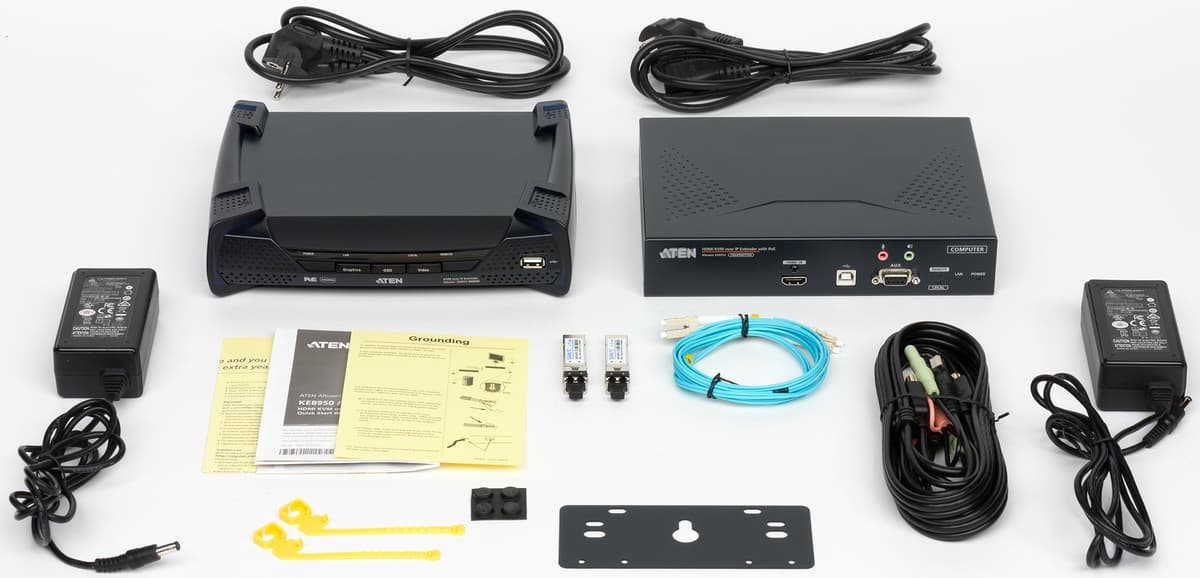 В комплект поставки входят основные модули передатчика и приемника, многофункциональный кабель для подключения к компьютеру, пластина для крепления передатчика, набор резиновых ножек для него, хомуты для фиксации кабелей HDMI и краткая печатная инструкция. В данном случае тестировались устройства с поддержкой PoE, поэтому блоки питания не входят в стандартную комплектацию и поставляются отдельно. Но на фотографию мы поместили все сразу, включая дополнительно предоставленные для тестирования представительством Aten два БП, два модуля SFP и оптический кабель.
