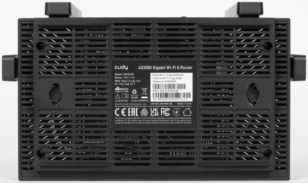 Кроме установки на столе, роутер можно и повесить на вертикальную поверхность. Для этого на дне есть два отверстия специальной формы. Ориентация при это может быть портами вниз или вверх. На дне также можно обнаружить информационную наклейку с данными для подключения к устройству.