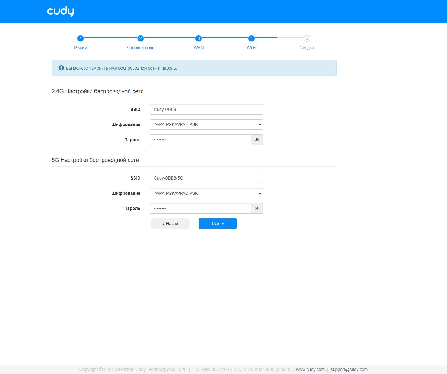 Далее будет предложен мастер настройки — выбор режима работы (маршрутизатор, точка доступа, повторитель, клиент), часовой пояс, тип подключения к провайдеру, имя устройства, названия и пароли беспроводных сетей. Вполне стандартный и понятный набор. В дальнейшем при необходимости можно снова запустить мастер настройки в пункте «Быстрые настройки» верхнего уровня меню.