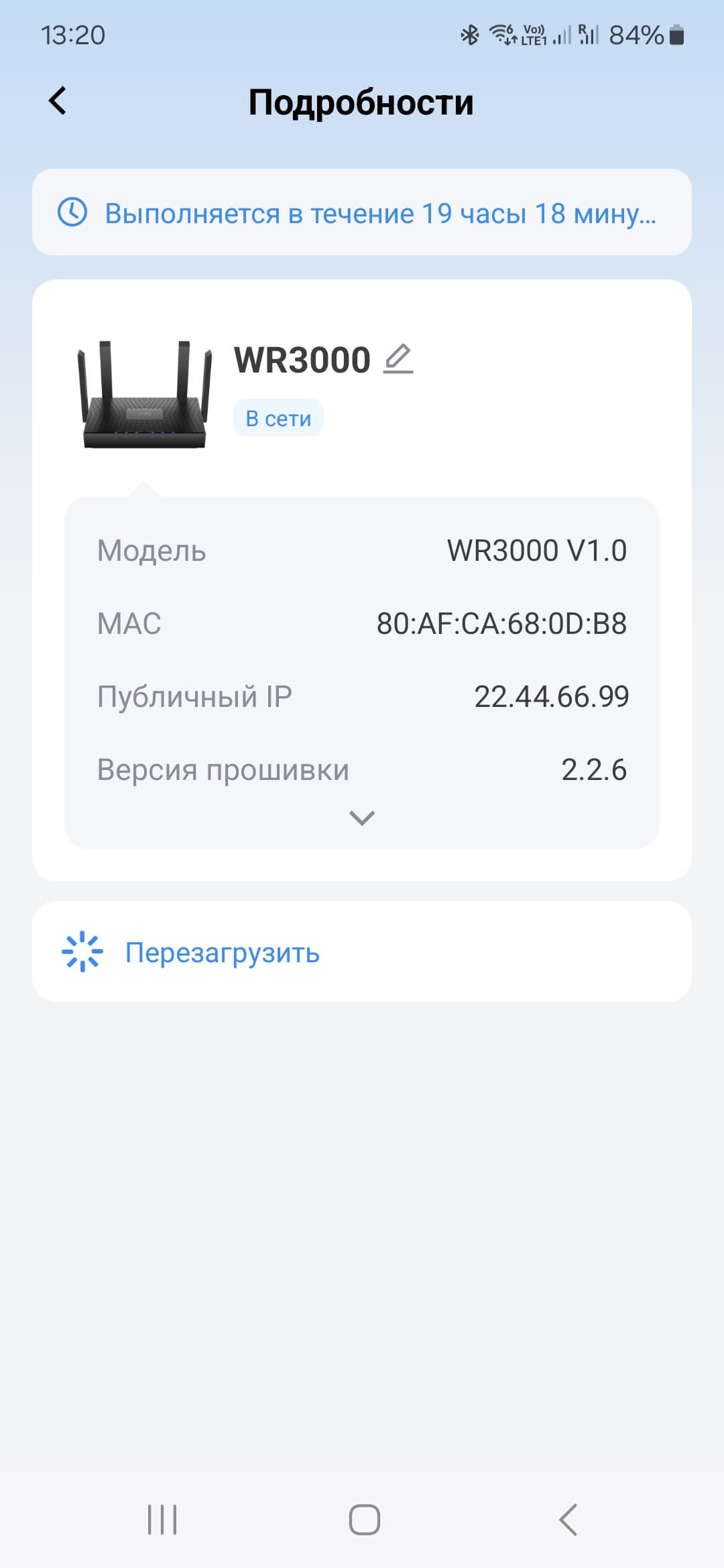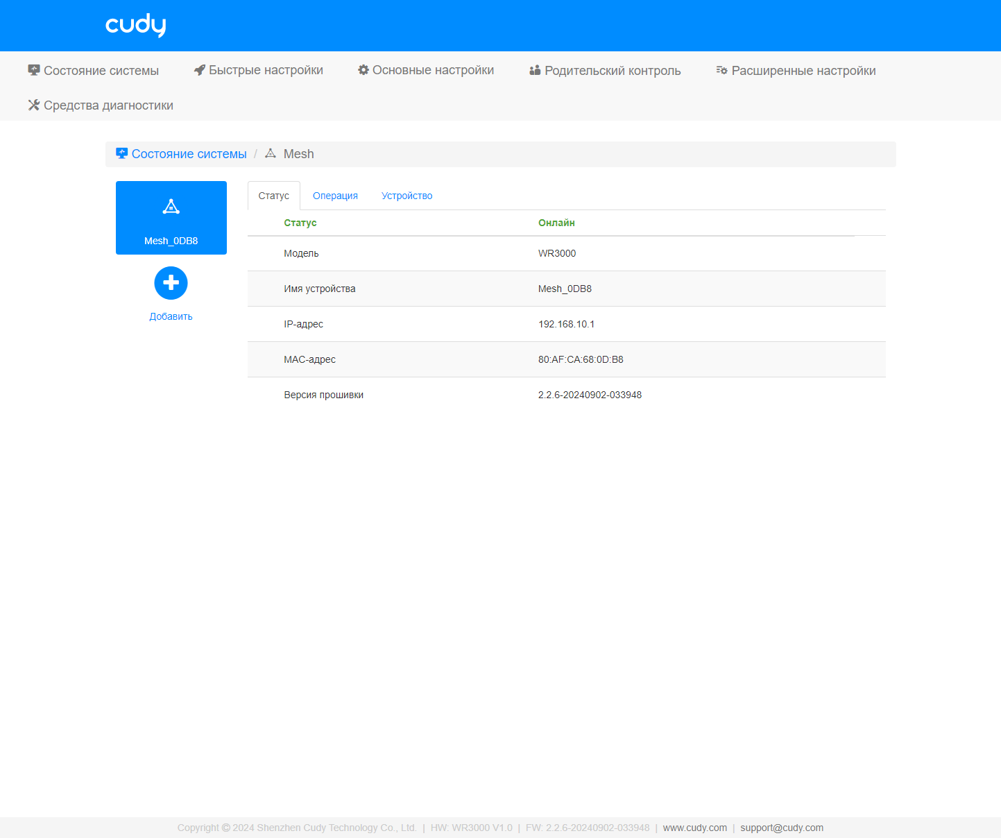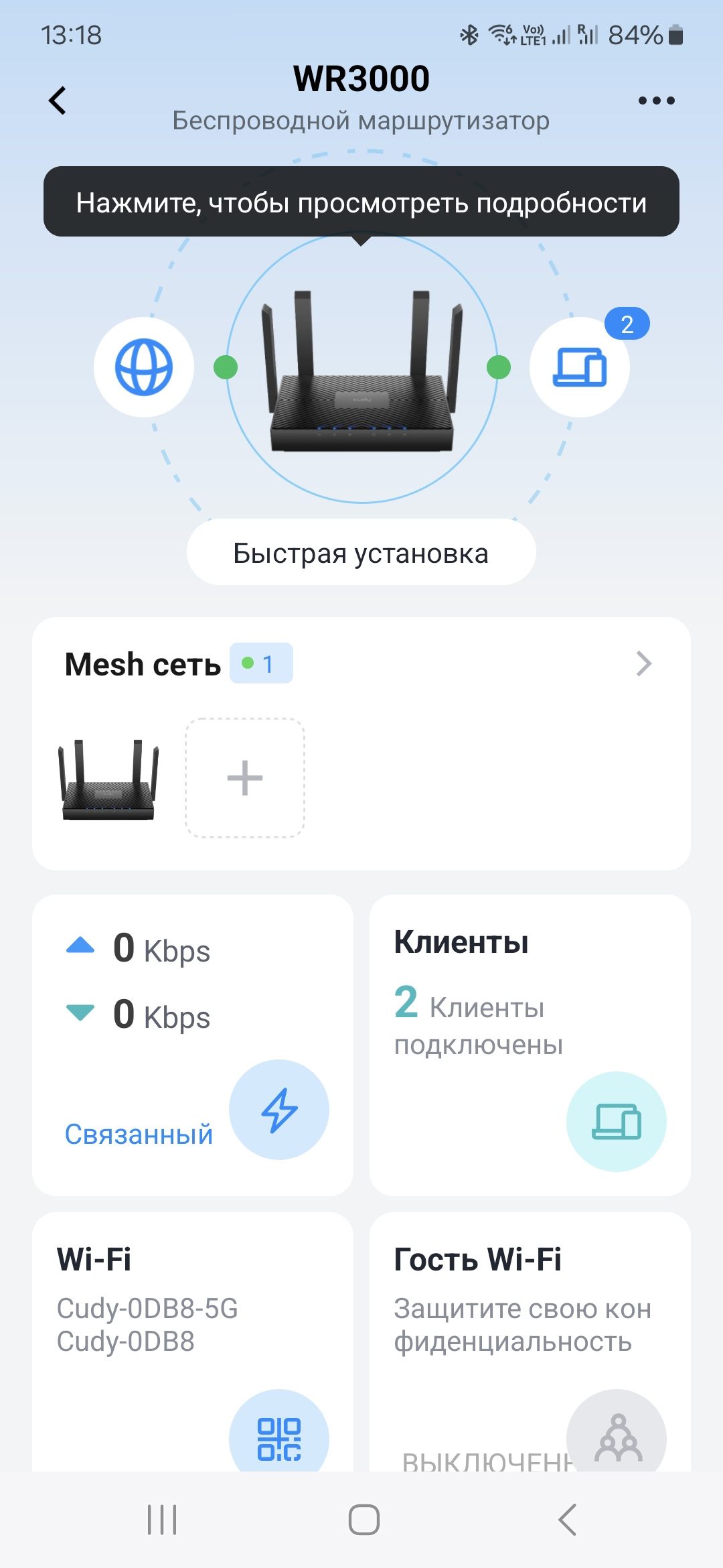 Обратите внимание на зеленый круг около изображения роутера — это переход к настройке Mesh-сети. Хотя можно воспользоваться и кнопкой «Подробнее» на одноименной плитке. У нас на тесте было только одно устройство, так что эту функциональность мы не проверили. Но технология в целом уже не новая, так что всё должно работать согласно заявленным возможностям — расширение зоны покрытия сети по кабелю или без него с автоматическим переключением клиентов на обеспечивающую лучше качество связи точку доступа. При этом на основном устройстве через соответствующее меню можно осуществлять некоторые сервисные операции с другими узлами.
