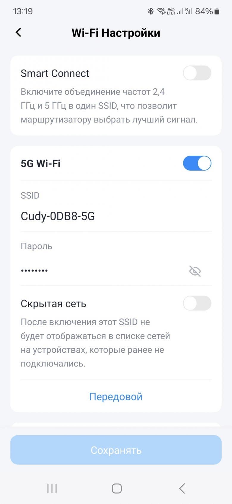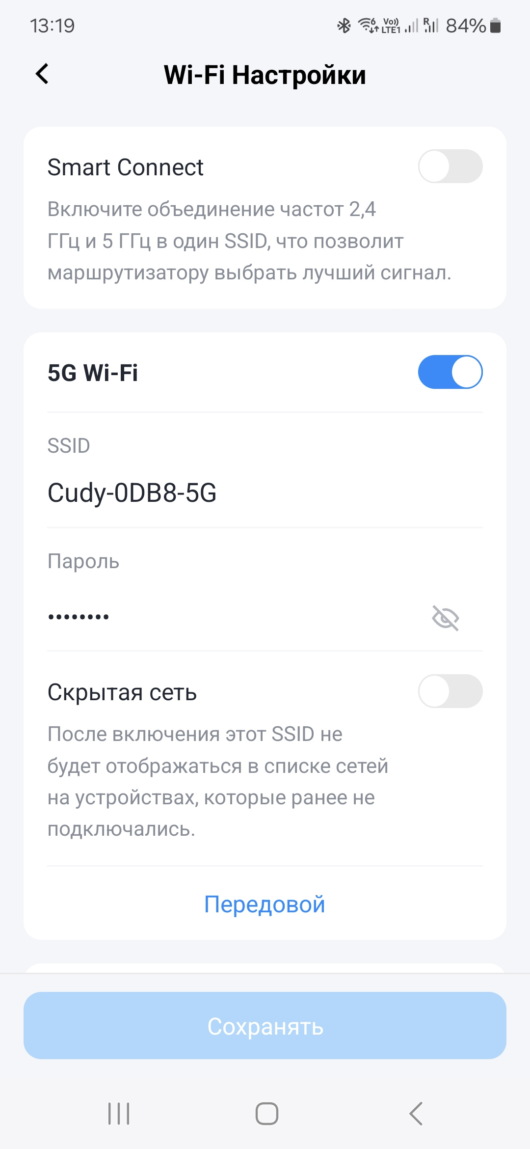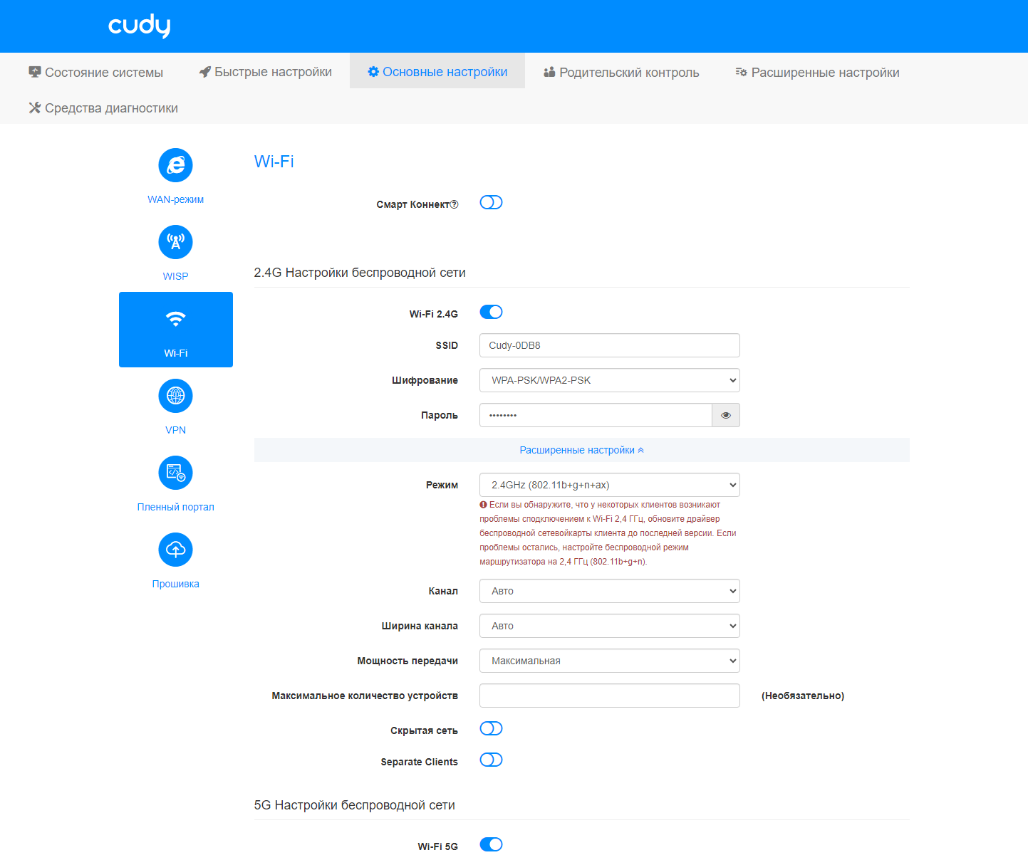Основные настройки беспроводных сетей обычны — имя, защита и пароль. Есть возможность использования технологии «Смарт Коннект», когда создается только одна сеть, а клиенты выбирают лучший для них вариант. В расширенных настройках точек доступа есть также такие параметры, как режим, номер канала, ширина канала, мощность передатчика и другие. Для 5 ГГц поддерживаются каналы 36—64 и 100—140.