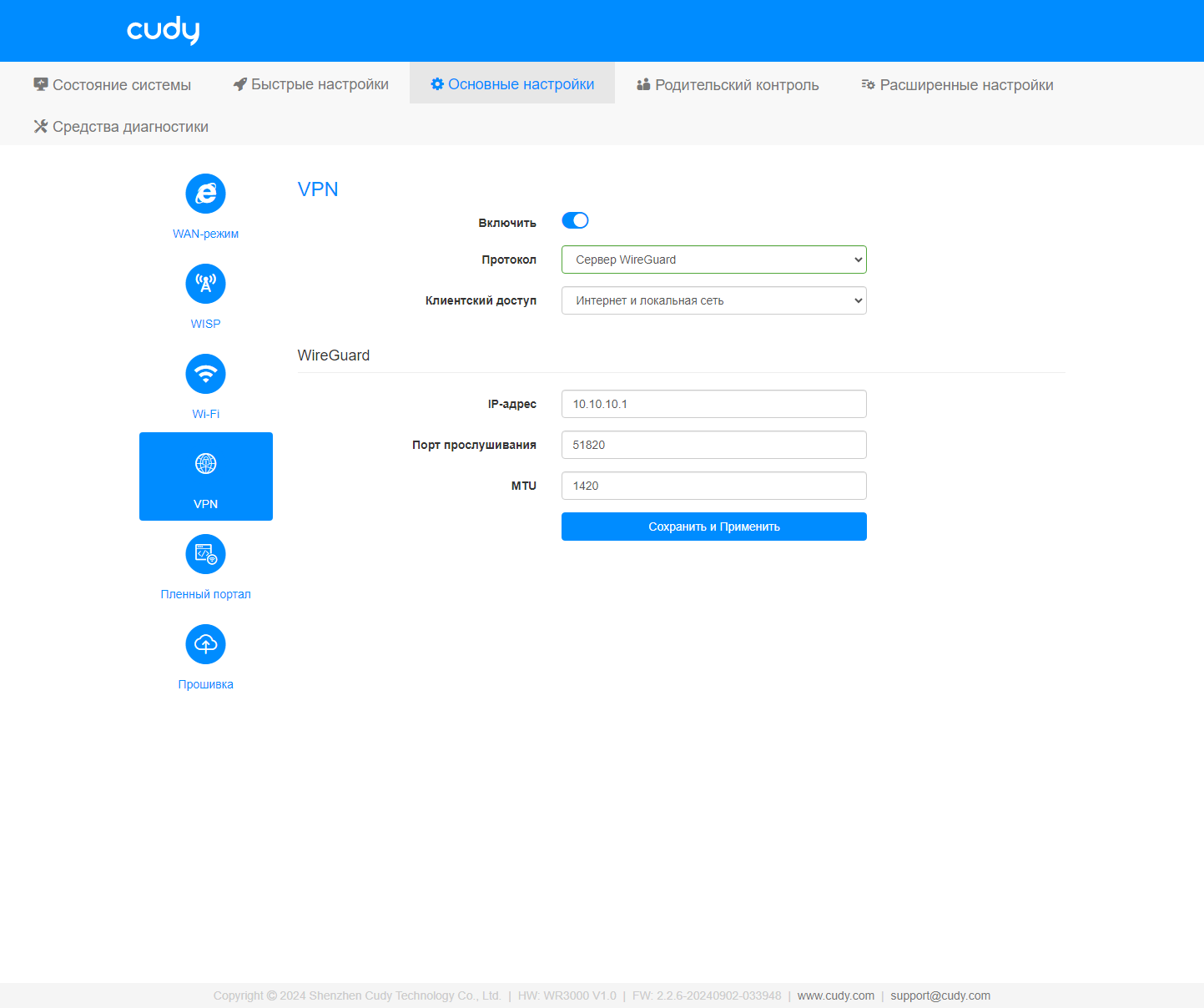 Следующая страница посвящена технологии VPN. Логика здесь правда несколько странная. Есть один общий выключатель и если его активировать, то появится выбор протокола и его настроек. При этом в списке «протоколов» идут PPTP, L2TP, OpenVPN и WireGuard в версиях сервера и клиента. Так что можно ли совместить сразу несколько вариантов — не очень понятно. Да и некоторые другие параметры для режима клиента выглядят не очевидно. Производителю стоит пересмотреть данный раздел или предоставить по нему актуальную документацию.