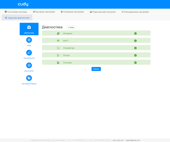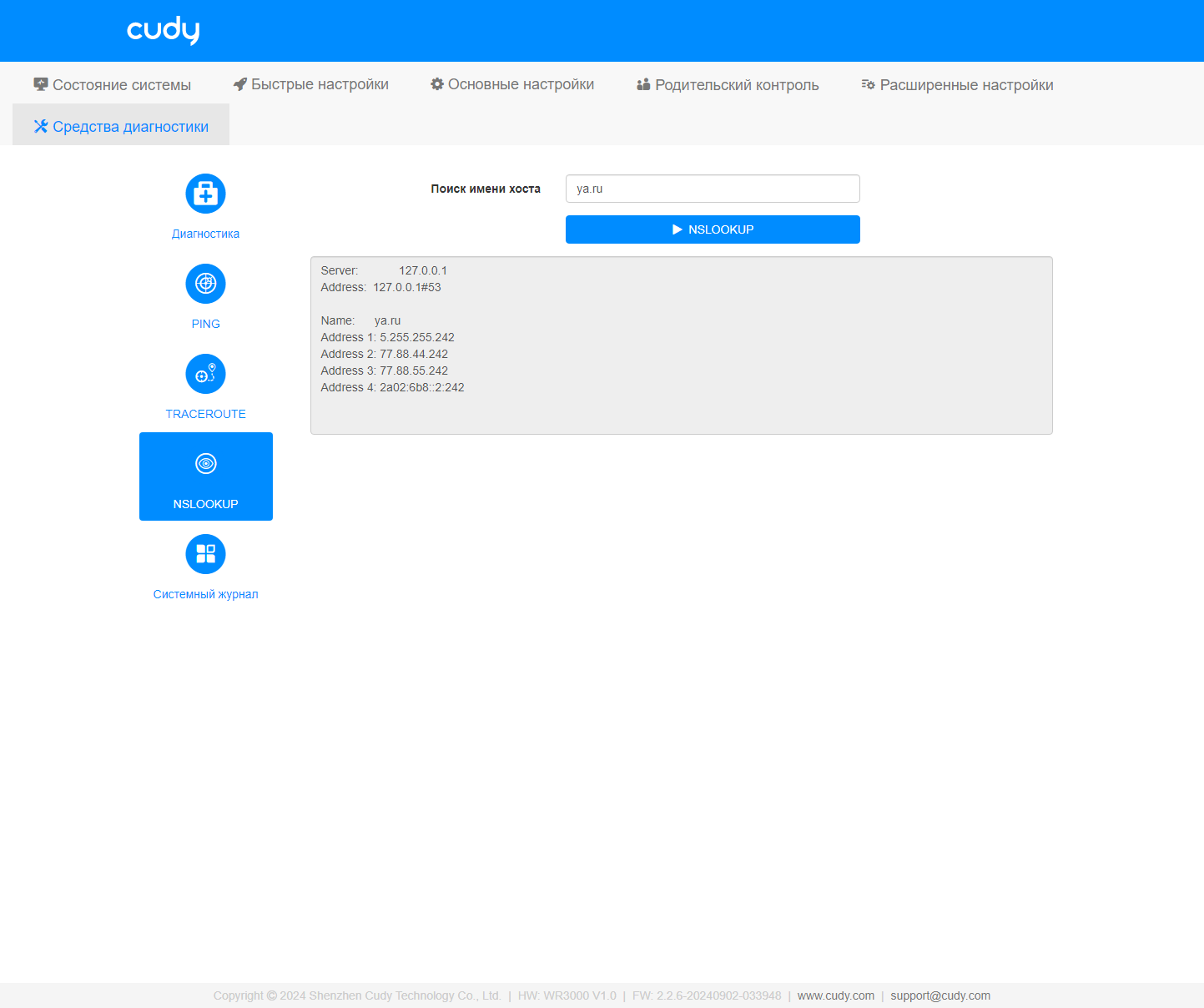Ну и далее идут знакомые утилиты ping, trace route и nslookup. Завершает группу страница системного журнала с возможностью скачивания.