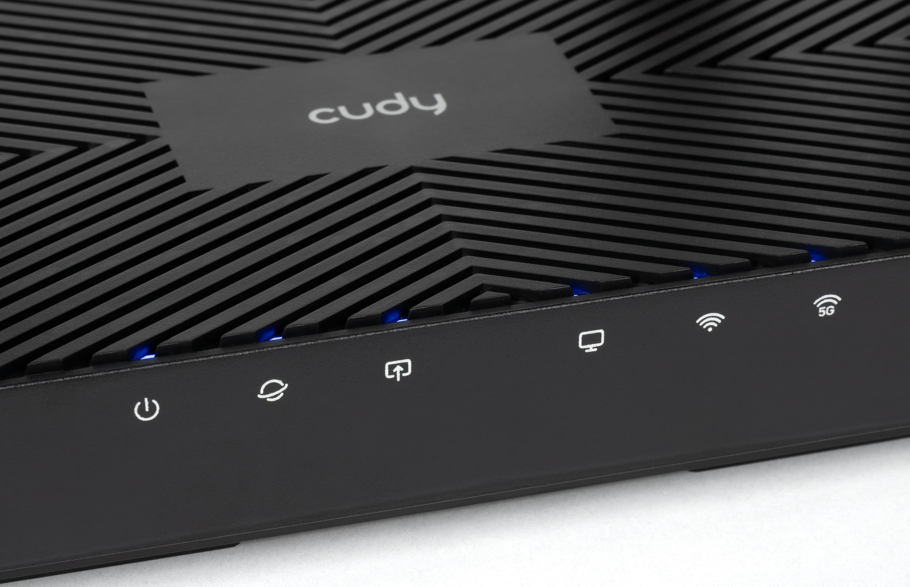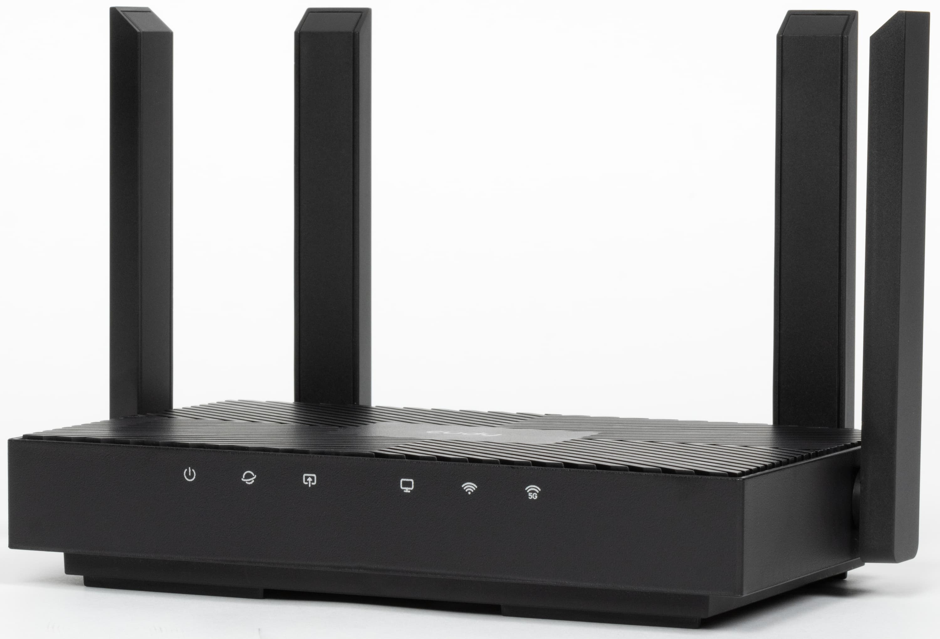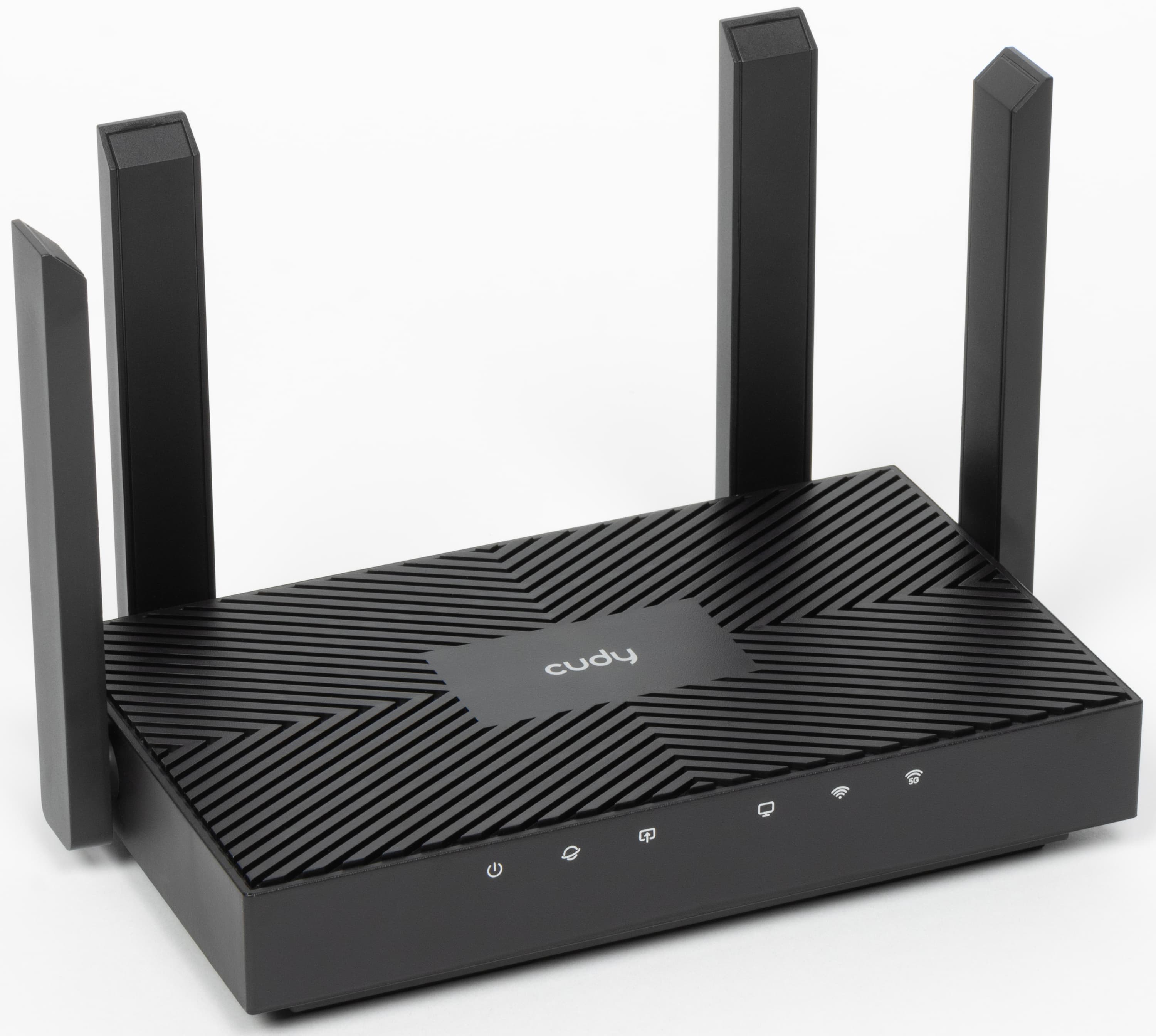 На углу между верхней и передней панелями расположены шесть светодиодов — состояние, интернет, кабель WAN, кабель LAN и два Wi-Fi по двум диапазонам. Излишней яркостью они докучать не будут, но и разглядеть их можно только с близкого расстояния.