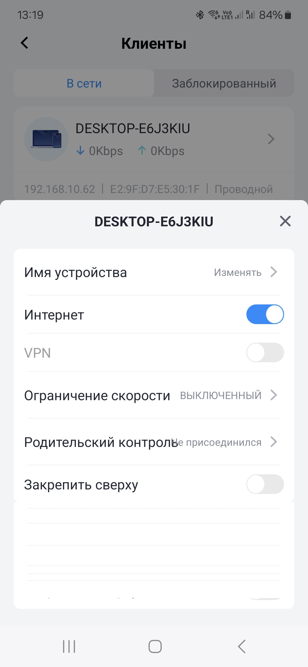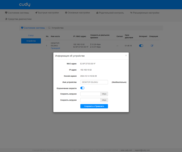 Также здесь можно найти настройки клиентов локальной сети — изменение имени, запрет доступа в интернет и установку ограничения скорости.