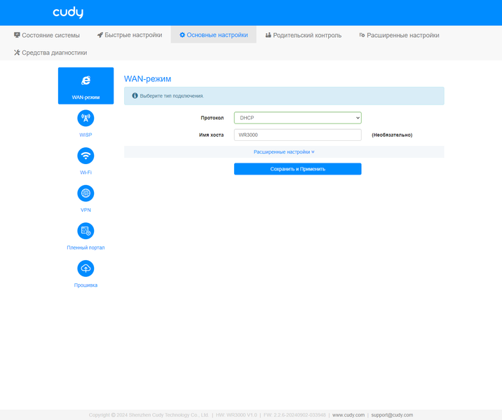 Для подключения к сети провайдера поддерживаются режимы IPoE, PPPoE, PPTP и L2TP. При необходимости можно использовать и режим WISP с подключением по Wi-Fi.