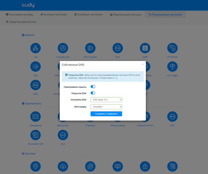 Из необычного здесь отметим функцию перехвата и перенаправления запросов DNS клиентов.