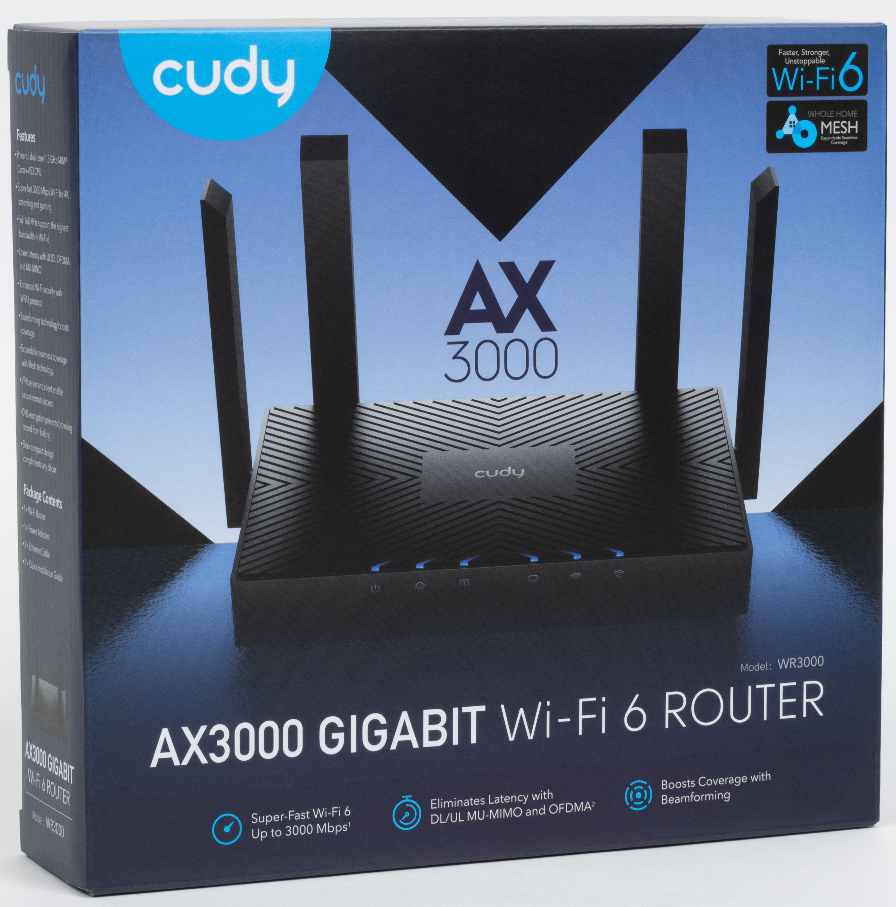 И хотя для требовательных пользователей компания предлагает модели с Wi-Fi 7 и быстрыми сетевыми портами, мы начнем знакомство с продуктами этого производителя с роутера WR3000, который относится к наиболее распространенному сегодня классу AX3000. Сразу скажем, что модель не новая, но при своей стоимости на уровне 6000 рублей она и сегодня является привлекательным вариантом для массового потребителя без особых требований к домашнему роутеру.