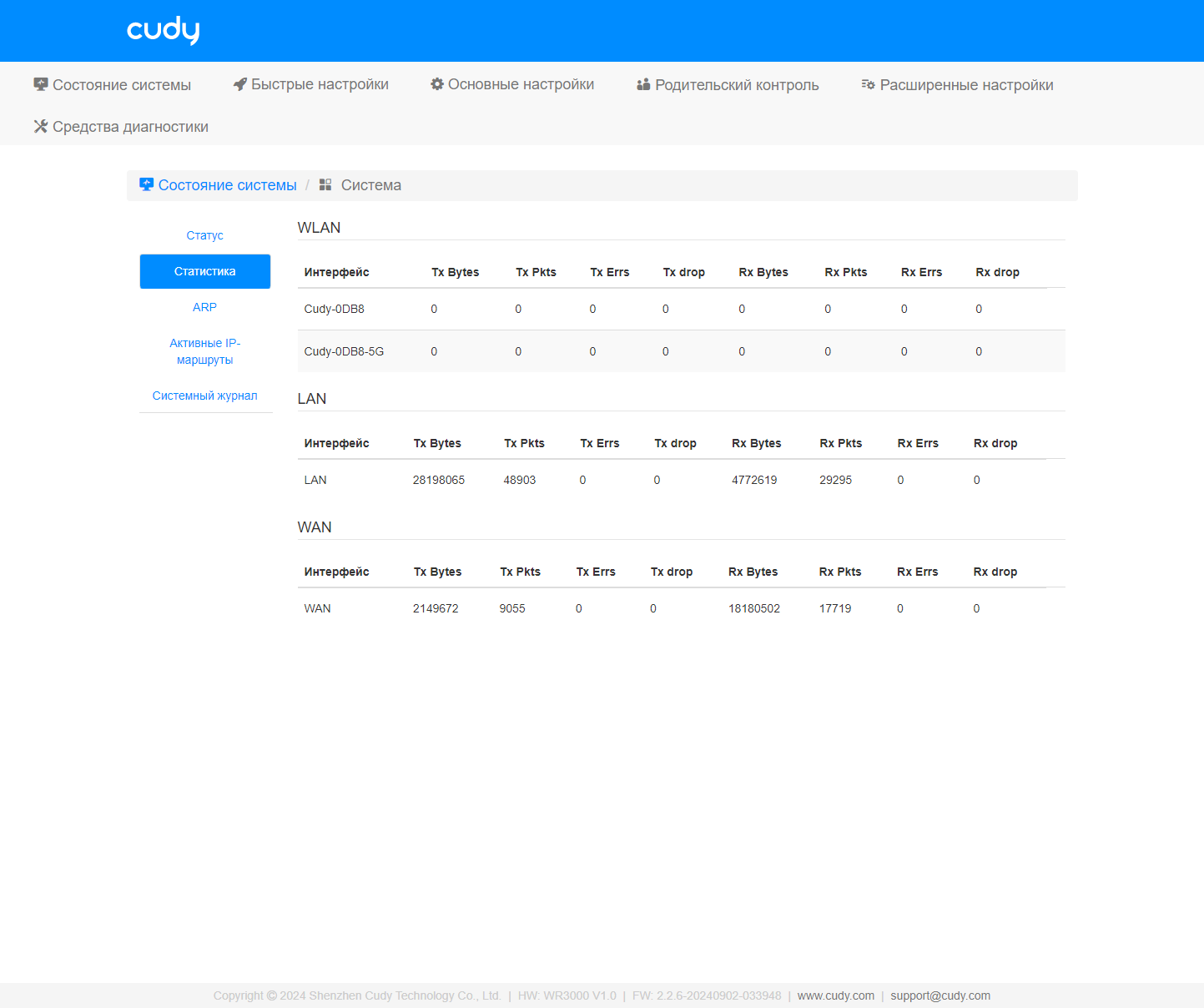 Раздел «Состояние системы» позволяет оценить текущие режимы работы устройства. Здесь приводится информация об адресах, беспроводных сетях, дополнительных сервисах (если включены) и так далее.