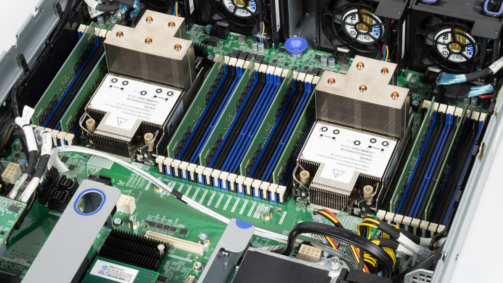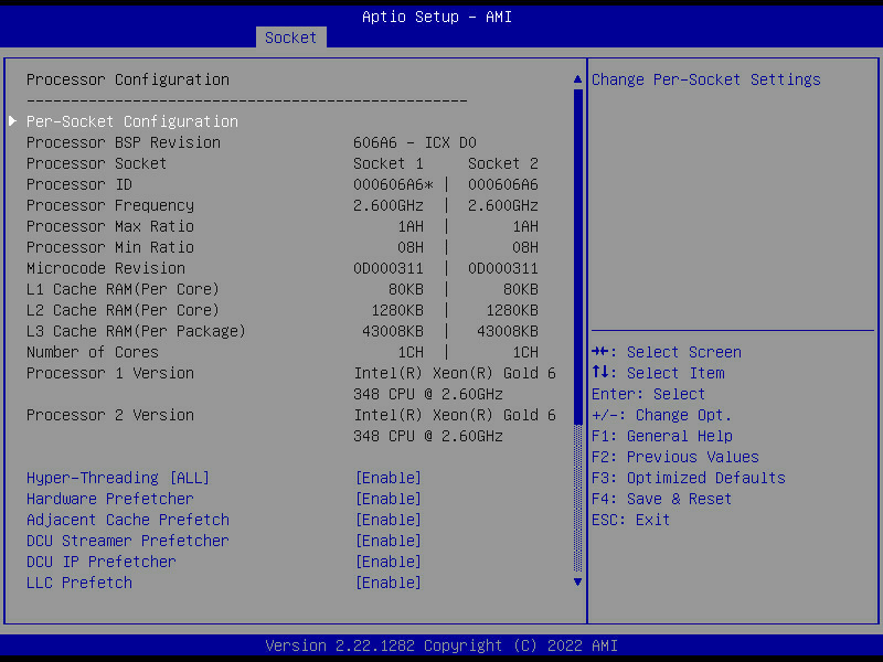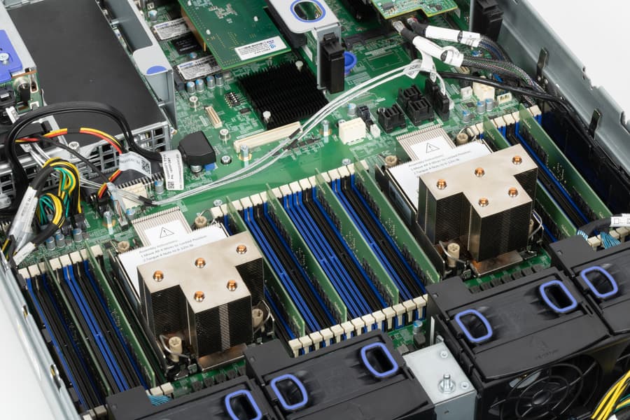 Два сокета FCLGA4189 для процессоров поддерживают процессоры Intel Xeon Scalable Processors третьего поколения с TDP до 270 Вт. В нашем случае были установлены два Intel Xeon Gold 6348: 28 ядер, 56 потоков, базовая частота 2,6 ГГц, максимальная Turbo-частота 3,5 ГГц, TDP 235 Вт.