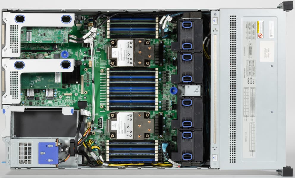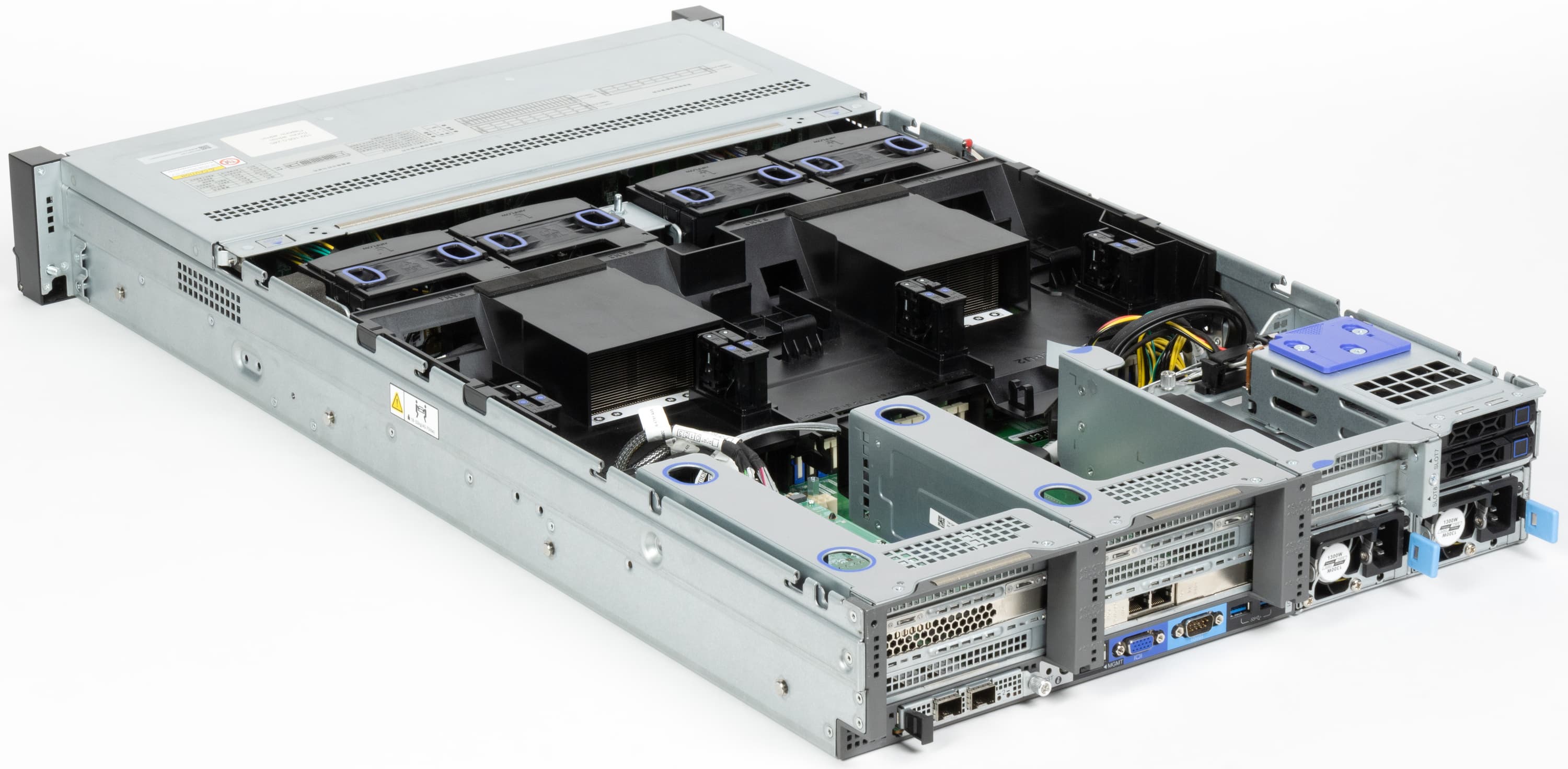 Данное решение в формате 2U имеет два сокета для процессоров Intel Xeon, большой максимальный объем оперативной памяти, эффективную систему охлаждения, возможность установки полноразмерных плат расширения, включая видеокарты, мощные блоки питания, поддержку накопителей с интерфейсами SATA, SAS и U.2.