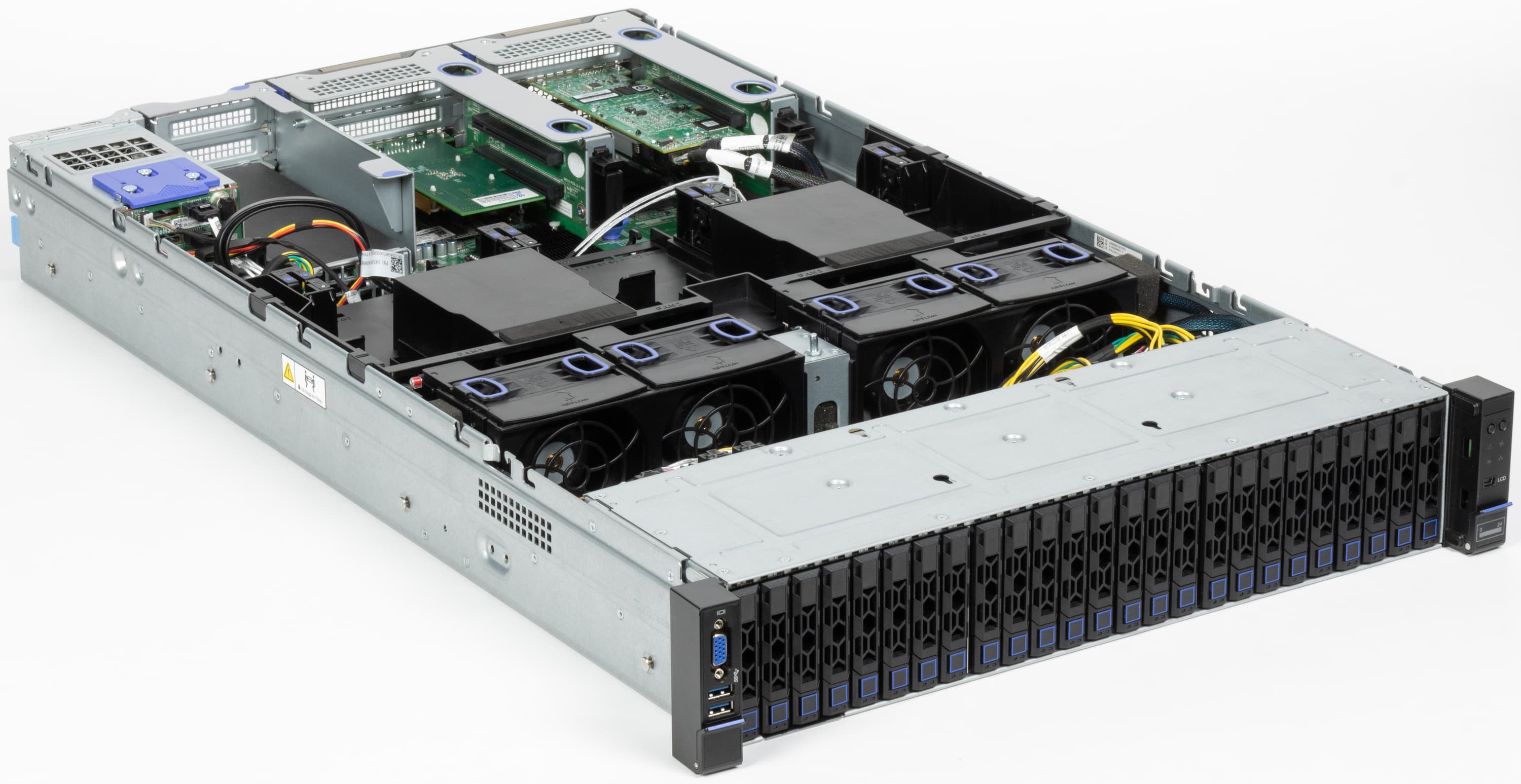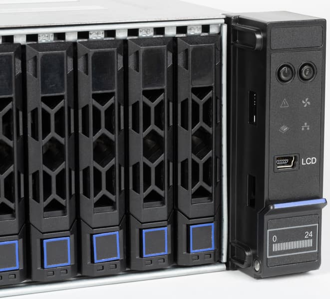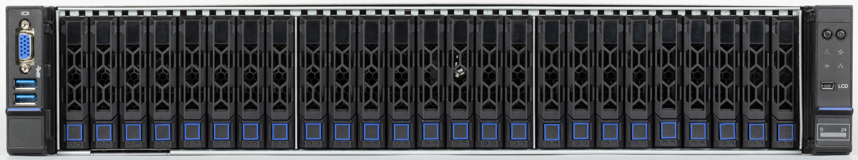 На лицевой панели сервера находятся 25 отсеков для накопителей формата 2,5″. Эта конфигурация сегодня наиболее распространена, если требуется получить локальное хранилище данных большой емкости и скорости в компактном формате.