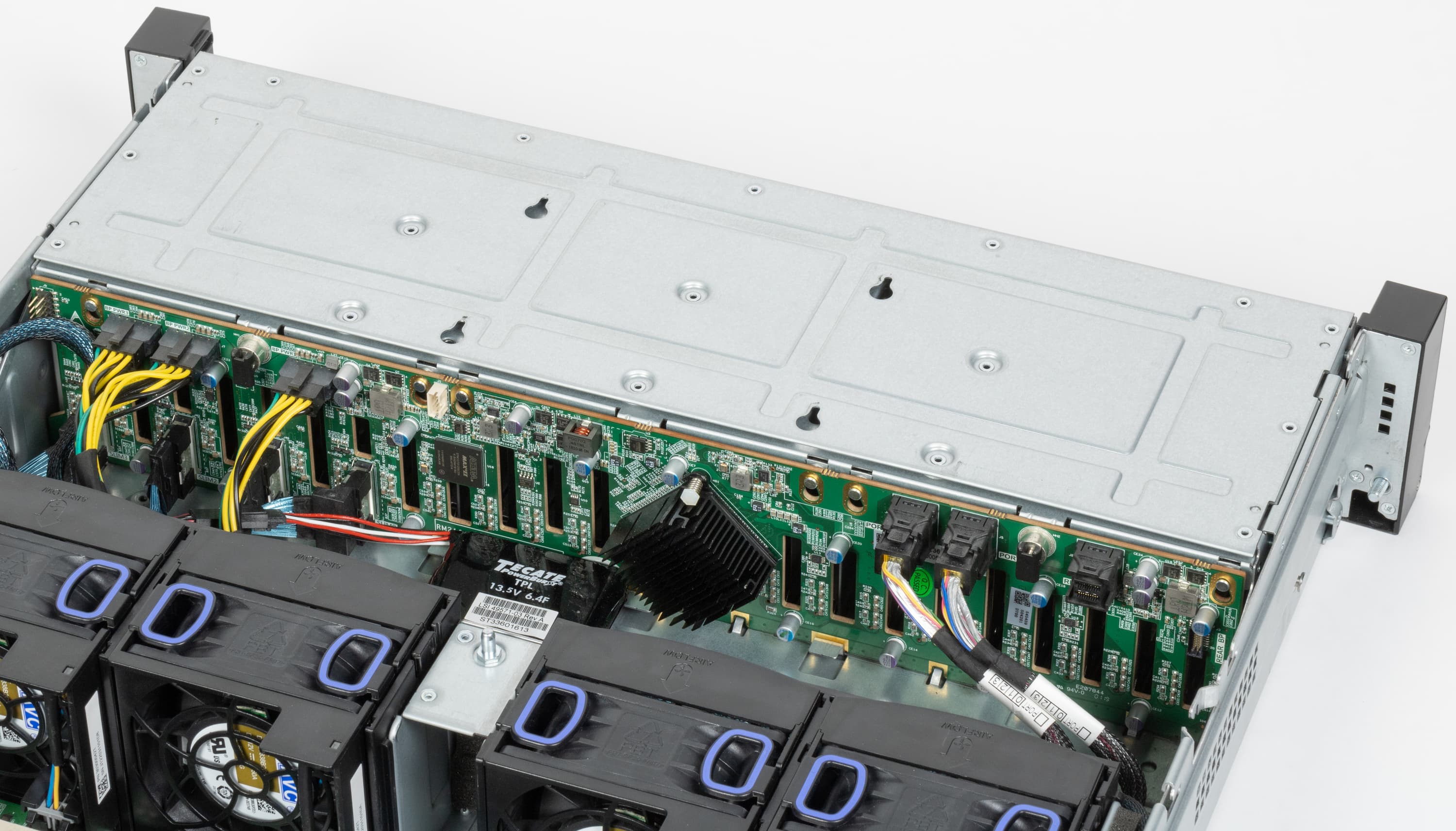 Слева вверху установлены два дополнительных отсека для накопителей 2,5″ с интерфейсом SATA. Под ними — два блока питания с поддержкой резервирования и горячей замены.