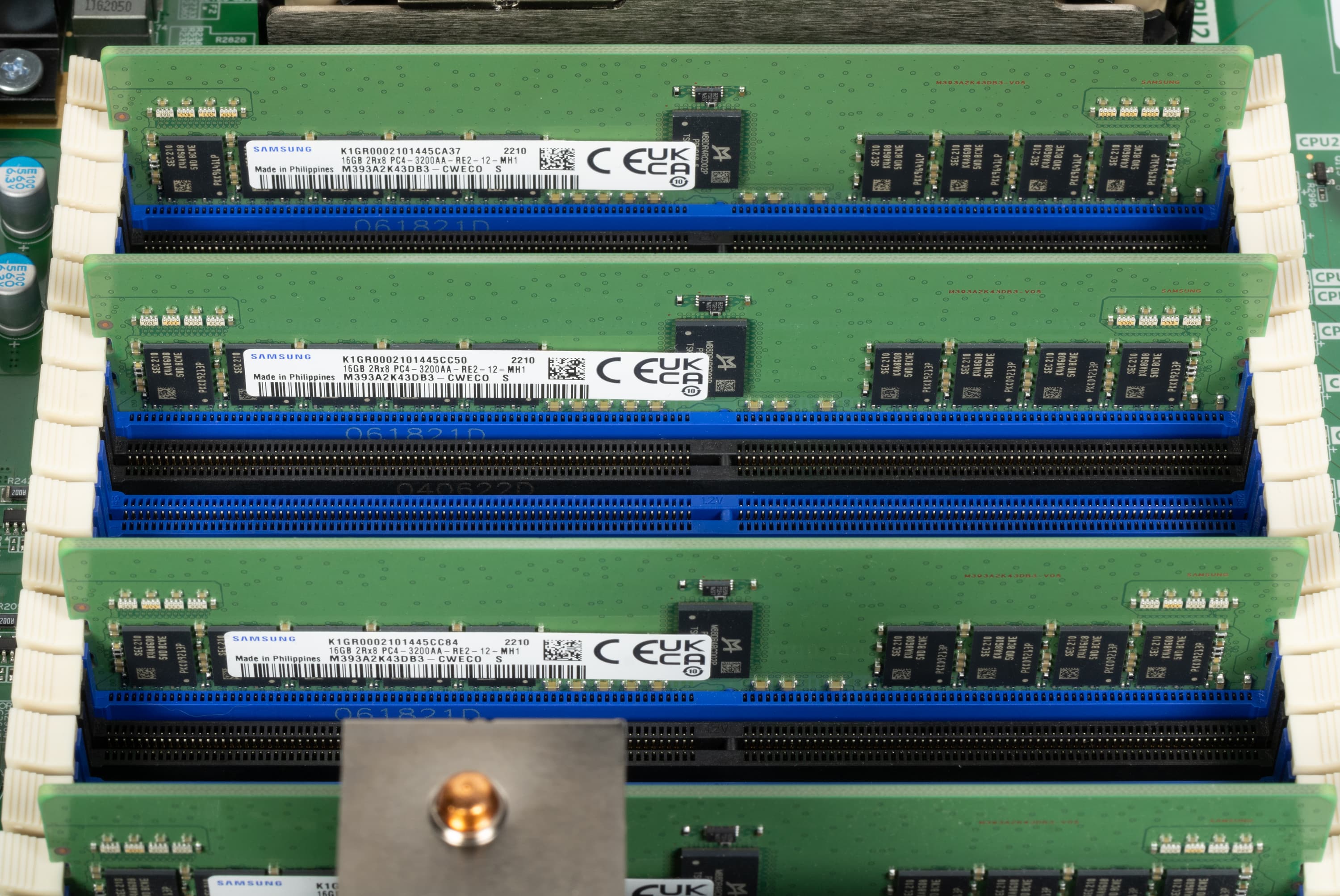 На материнской плате предусмотрено 32 слота для оперативной памяти DDR4-3200 с поддержкой ECC. Благодаря этому максимальный поддерживаемый объем составляет 8 ТБ. В тестируемой конфигурации было установлено восемь модулей оперативной памяти Samsung M393A2K43DB3-CWE по 16 ГБ, что дало 128 ГБ общего объема.