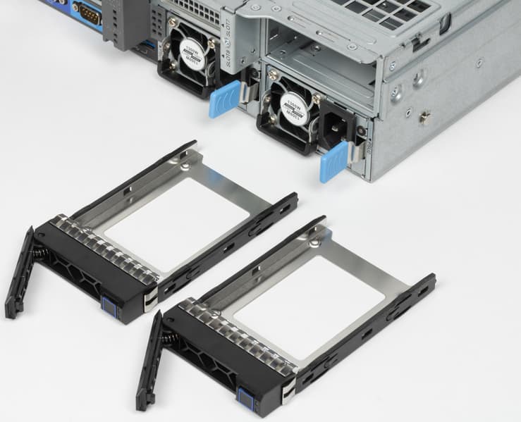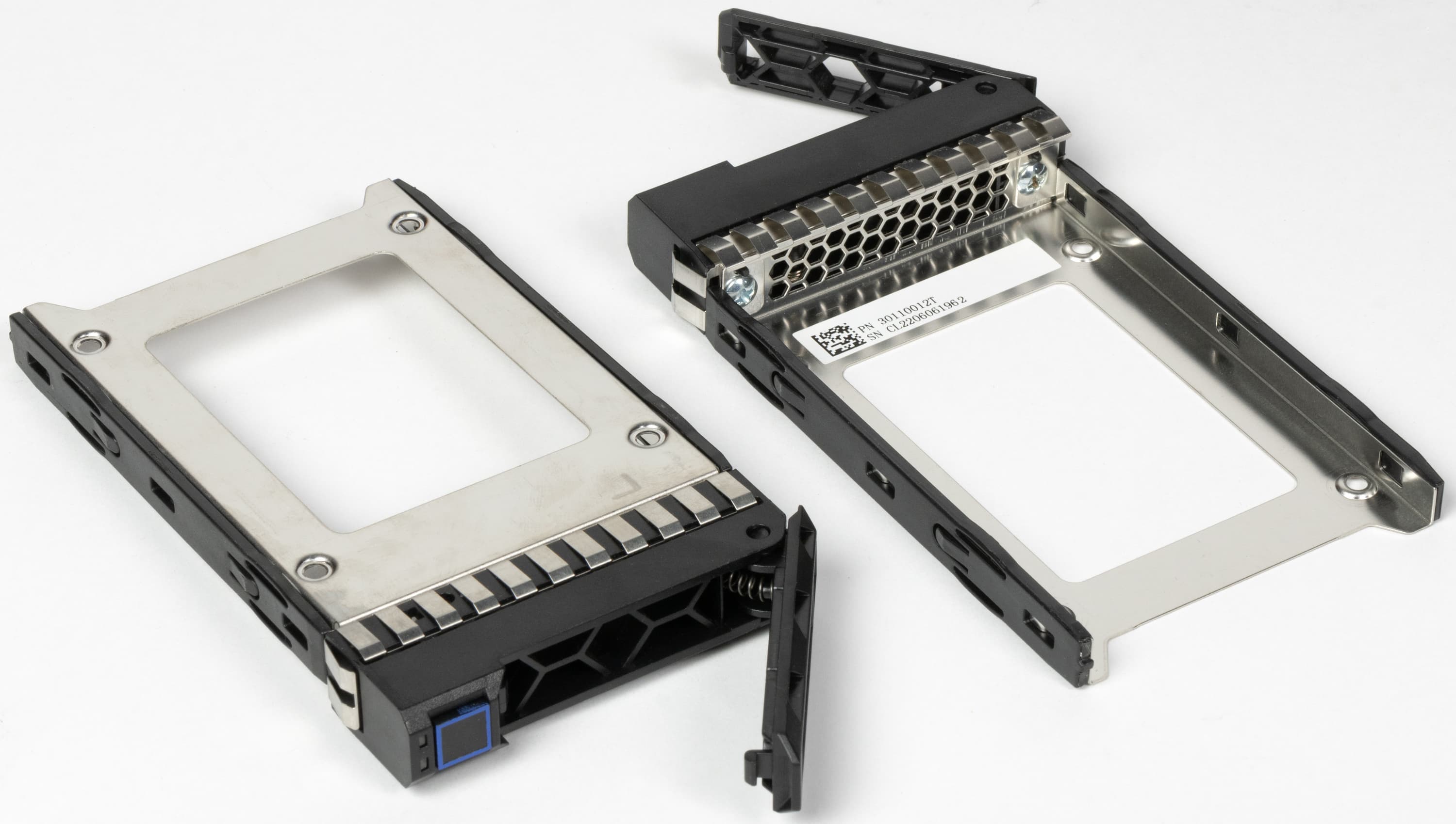 Накопители в основные отсеки устанавливаются через салазки, изготовленные из металла и пластика. Диск на них закрепляется четырьмя винтами. На салазках предусмотрен вывод двух светодиодов состояния дисков. Отметим отсутствие дополнительной защиты от случайного открытия — для этой операции достаточно просто нажать кнопку в нижней части слота.