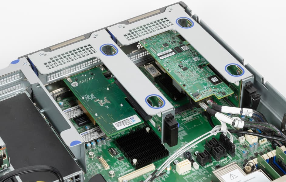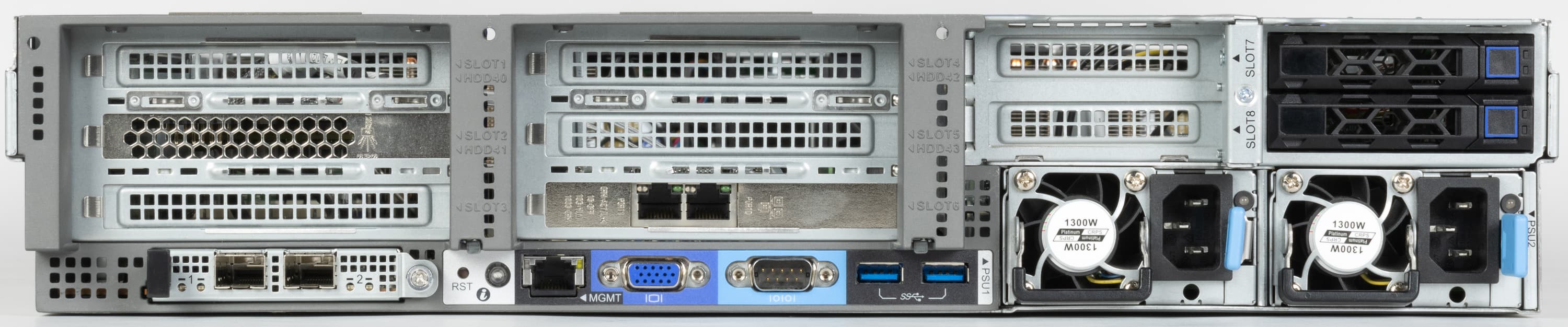 Внизу справа идет слот OCP, в нашем случае занятый сетевой картой на два порта SFP28 с поддержкой скоростей 10/25 Гбит/с. Далее находятся сетевой порт IPMI, выход VGA, последовательный порт и два порта USB 3.0. Есть также кнопка-индикатор ID и скрытая кнопка сброса BMC/NMI.