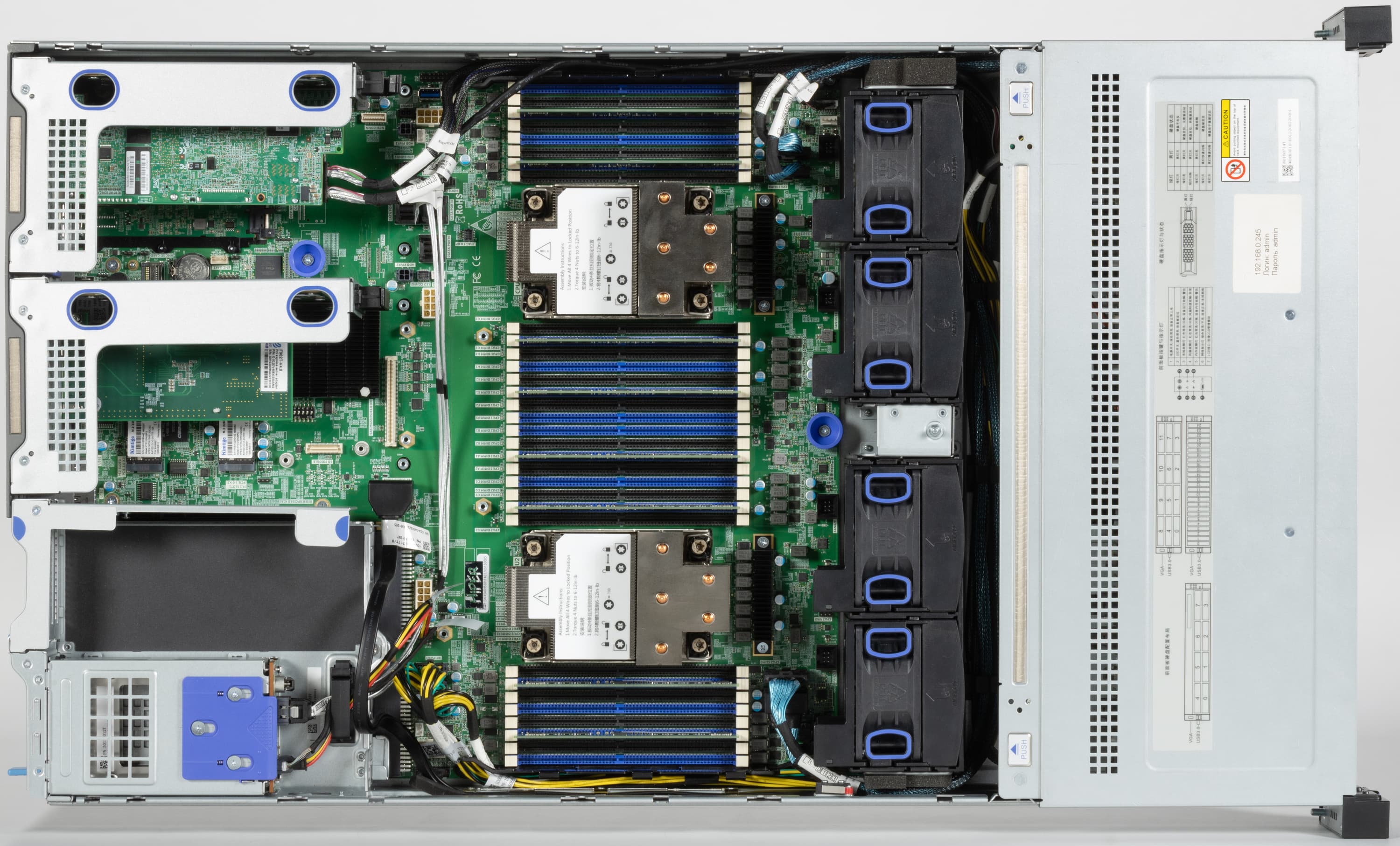 Сама конструкция сервера традиционна. После дисковых отсеков идет блок охлаждения из четырех вентиляторов и материнская плата с картами расширения и блоки питания.