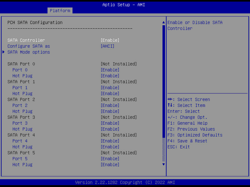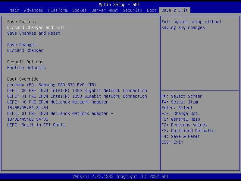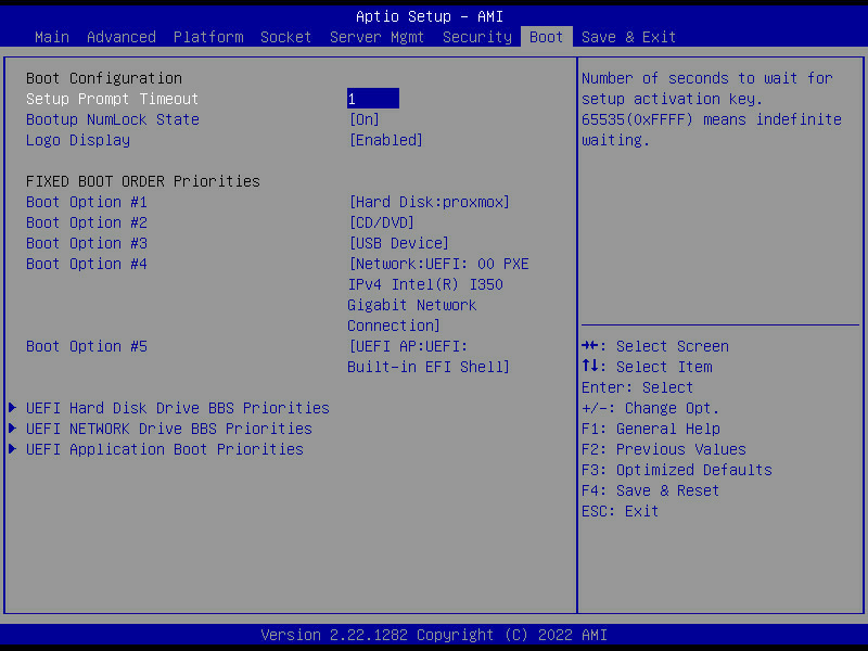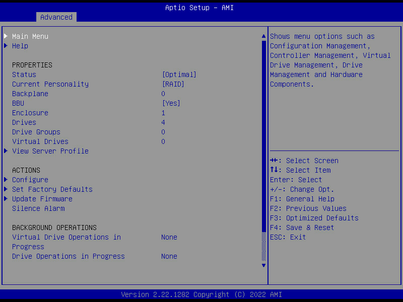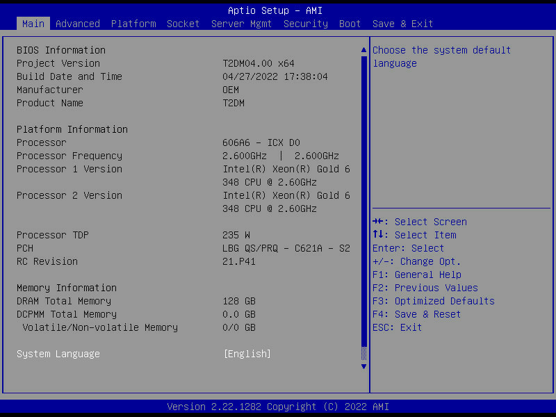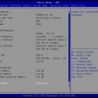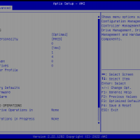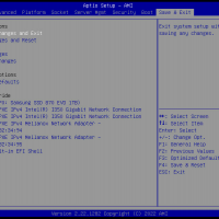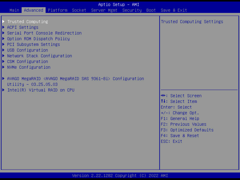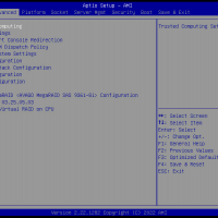 BIOS материнской платы сервера, как нетрудно было догадаться, тоже AMI. Так что всё стандартно и привычно. В большинстве случаев здесь нужно будет уделить внимание только настройке BMC и загрузочного устройства, всё остальное обычно уже настроено оптимально для сервера. Есть доступ к настройкам и дисковых контроллеров — встроенного Intel VROC и внешней модели Broadcom/LSI, что упрощает конфигурацию дисковых массивов. Конечно, поддерживается виртуализация, SR-IOV, UEFI, загрузка по сети и другие современные функции.